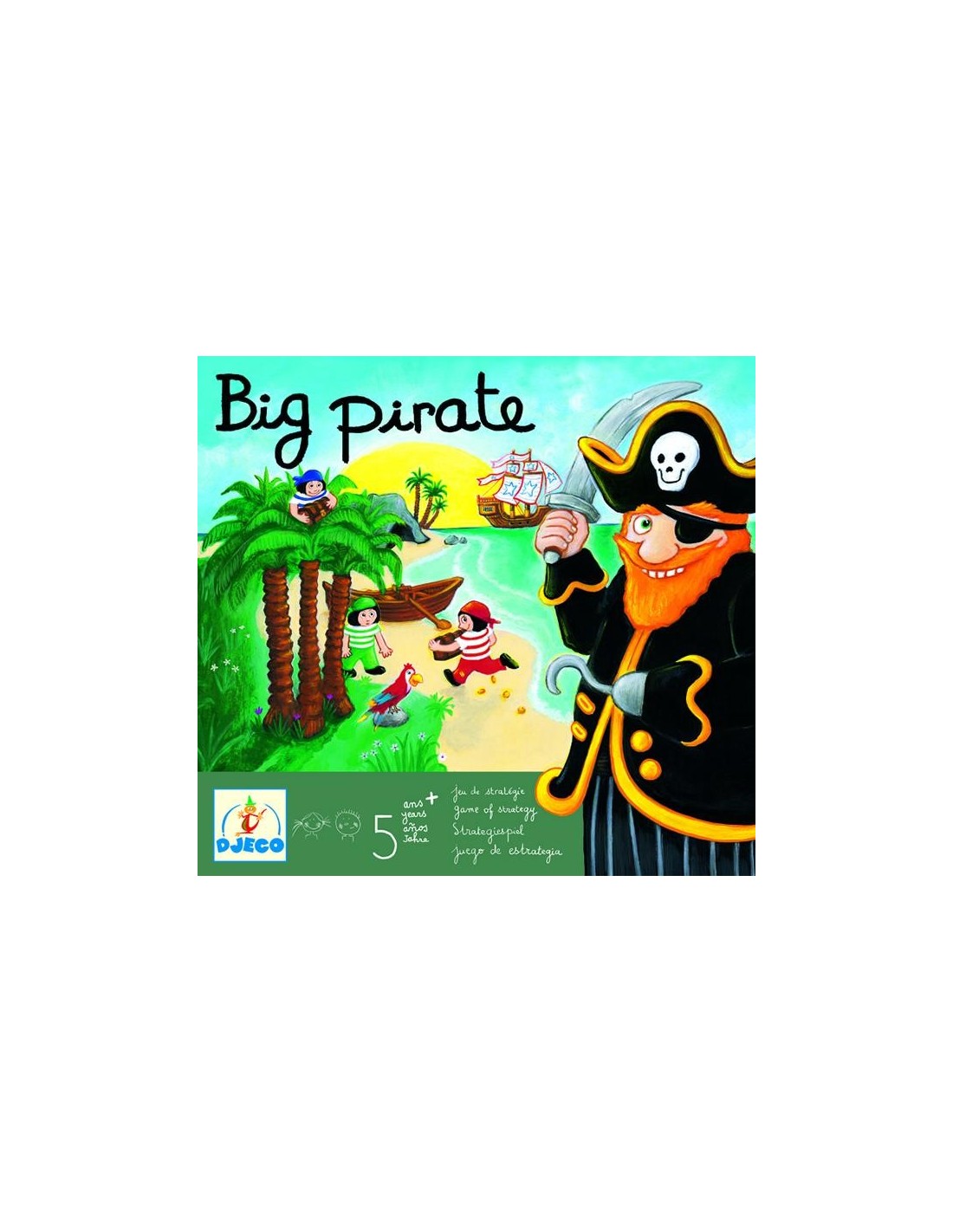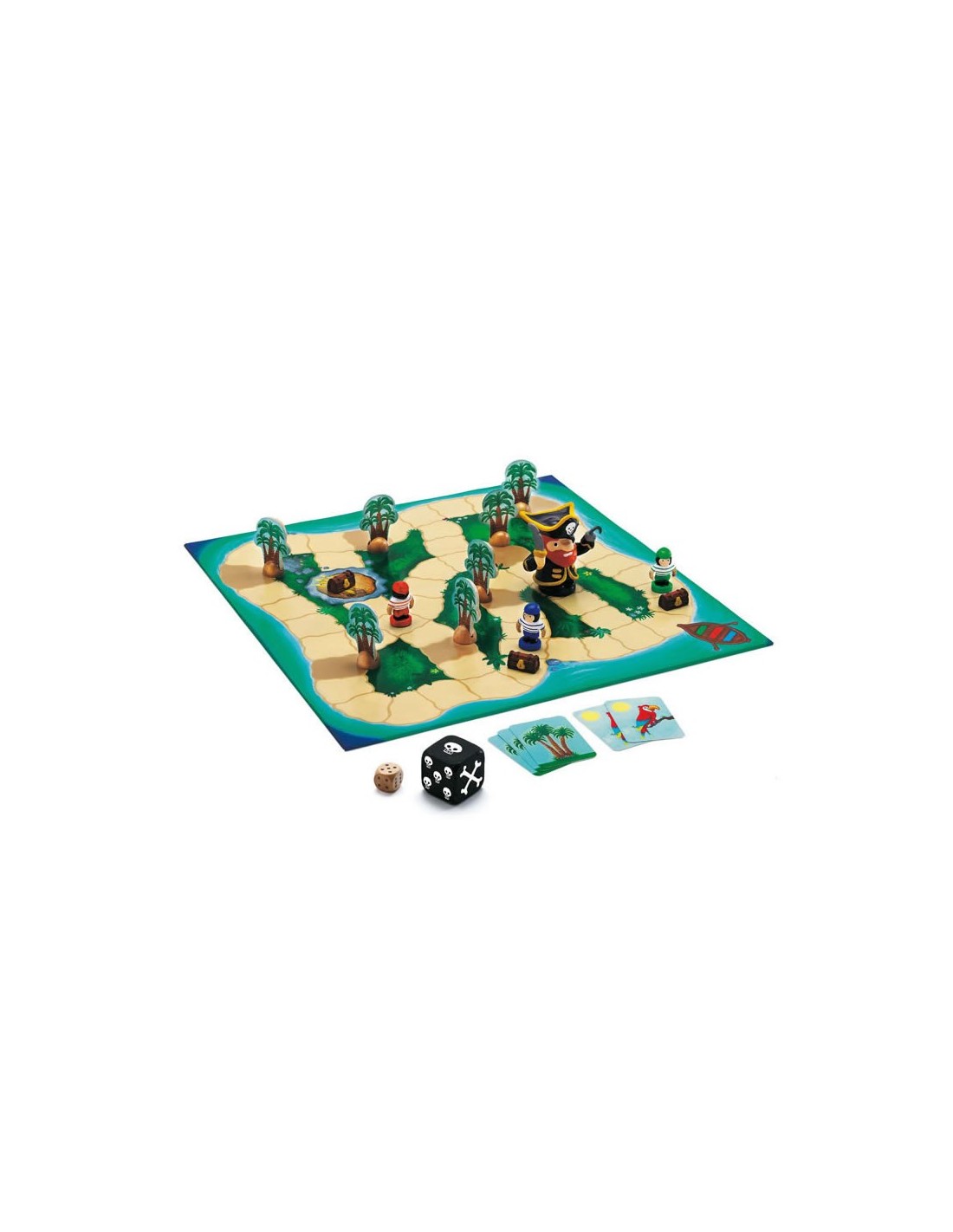 En aquest joc d'estratègia, els grumets intentaran robar el tresor del gran pirata abans que aquest els capturi. Munta el tauler, reparteix les cartes, tira els daus i ¡que comenci la partida! De 2 a 4 jugadors. Inclou: 1 tauler, 13 cartes, 7 palmeres, 3 grumets, 1 pirata gran, 1 dau gran, 1 dau petit.