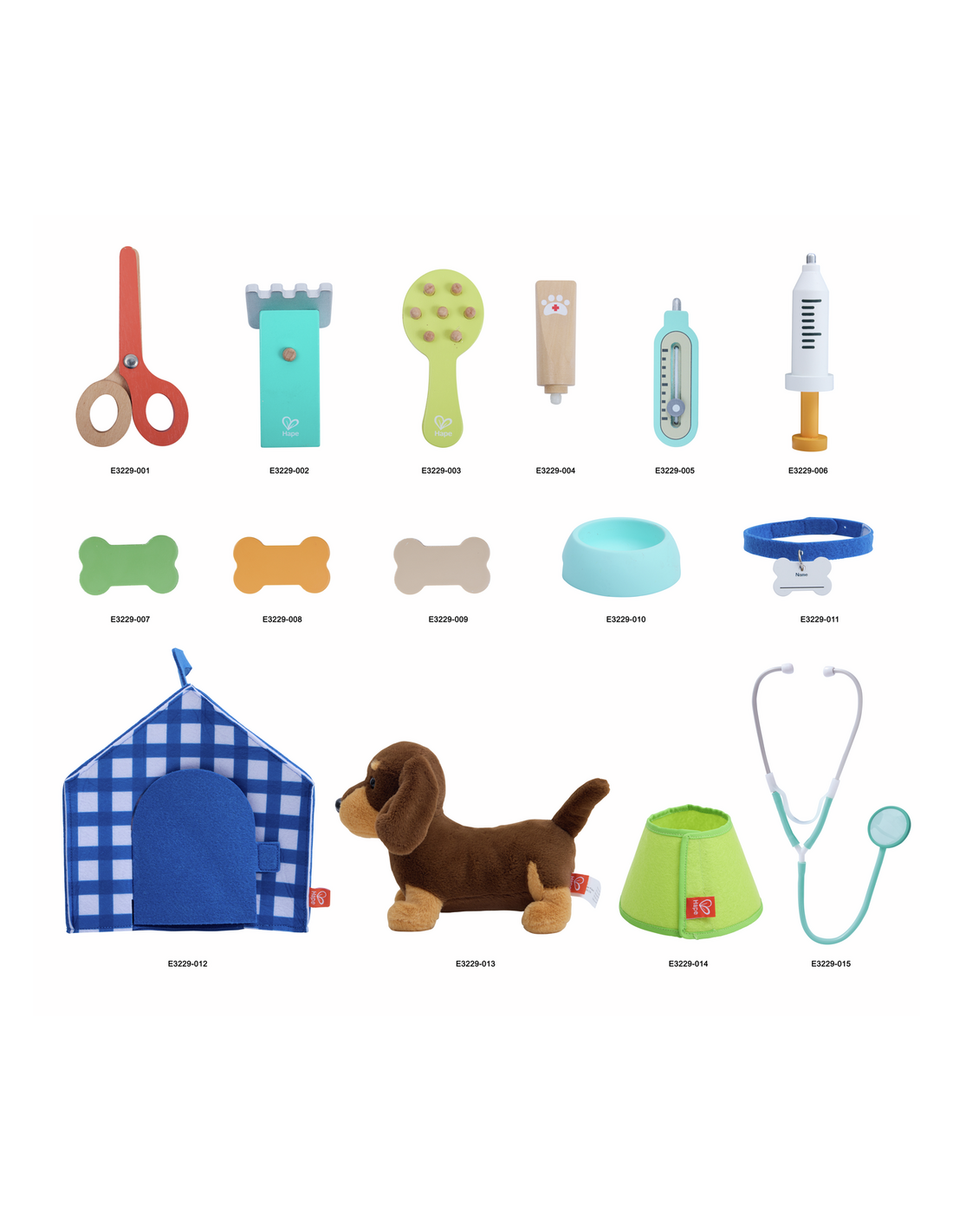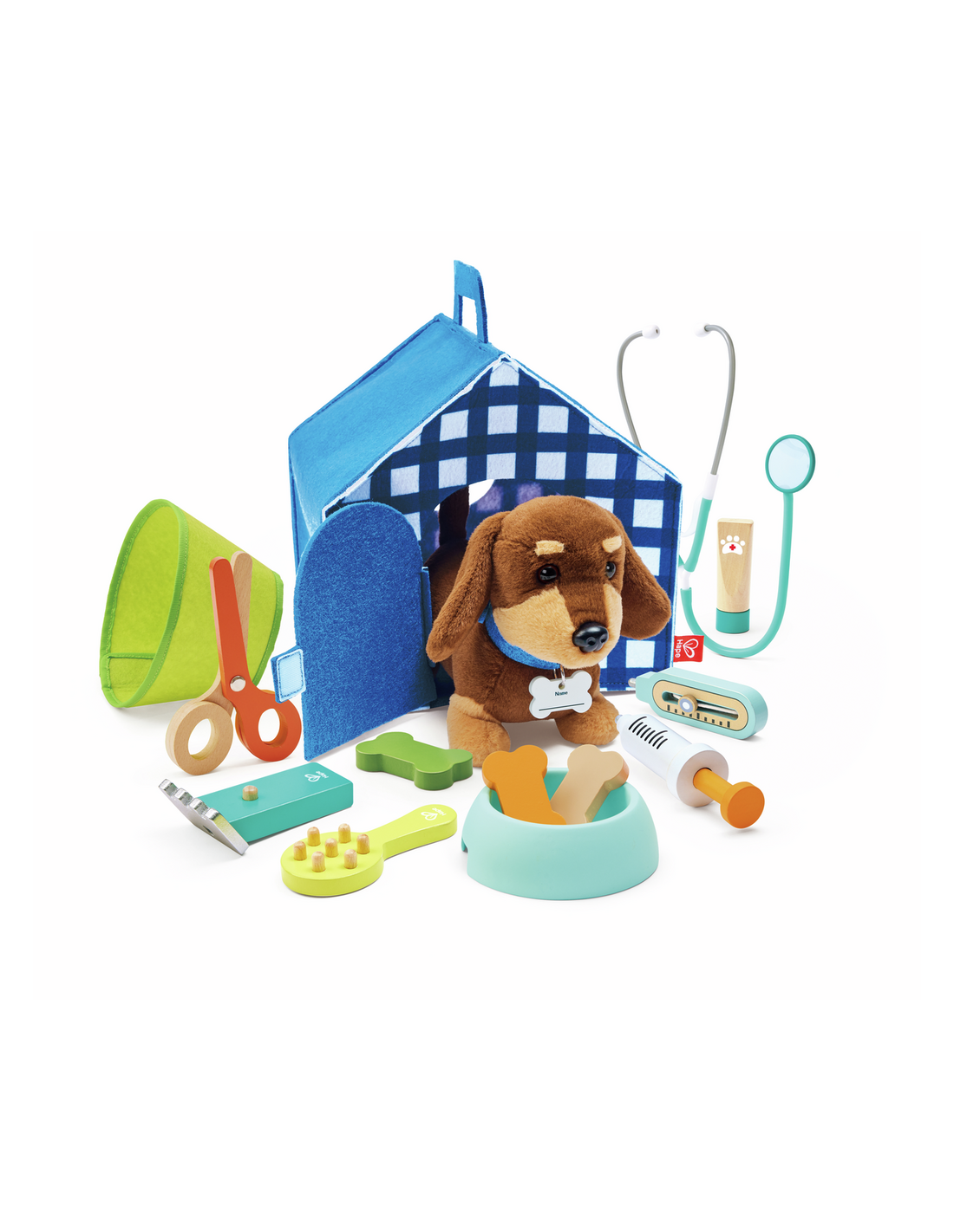 El joc incorpora una àmplia varietat d'accessoris veterinaris realistes, com un estetoscopi, una xeringa, tisores i altres utensilis essencials del treball clínic. Gràcies a aquestes eines, els nens poden simular revisions, cures, vacunacions i diferents procediments veterinaris, aprenent mentre juguen. A més, la caseta de gos portàtil inclosa actua com un espai de joc addicional i com un pràctic lloc d'emmagatzematge. La seva ansa facilita que els petits portin el set a qualsevol lloc, fomentant l'autonomia i l'organització.
