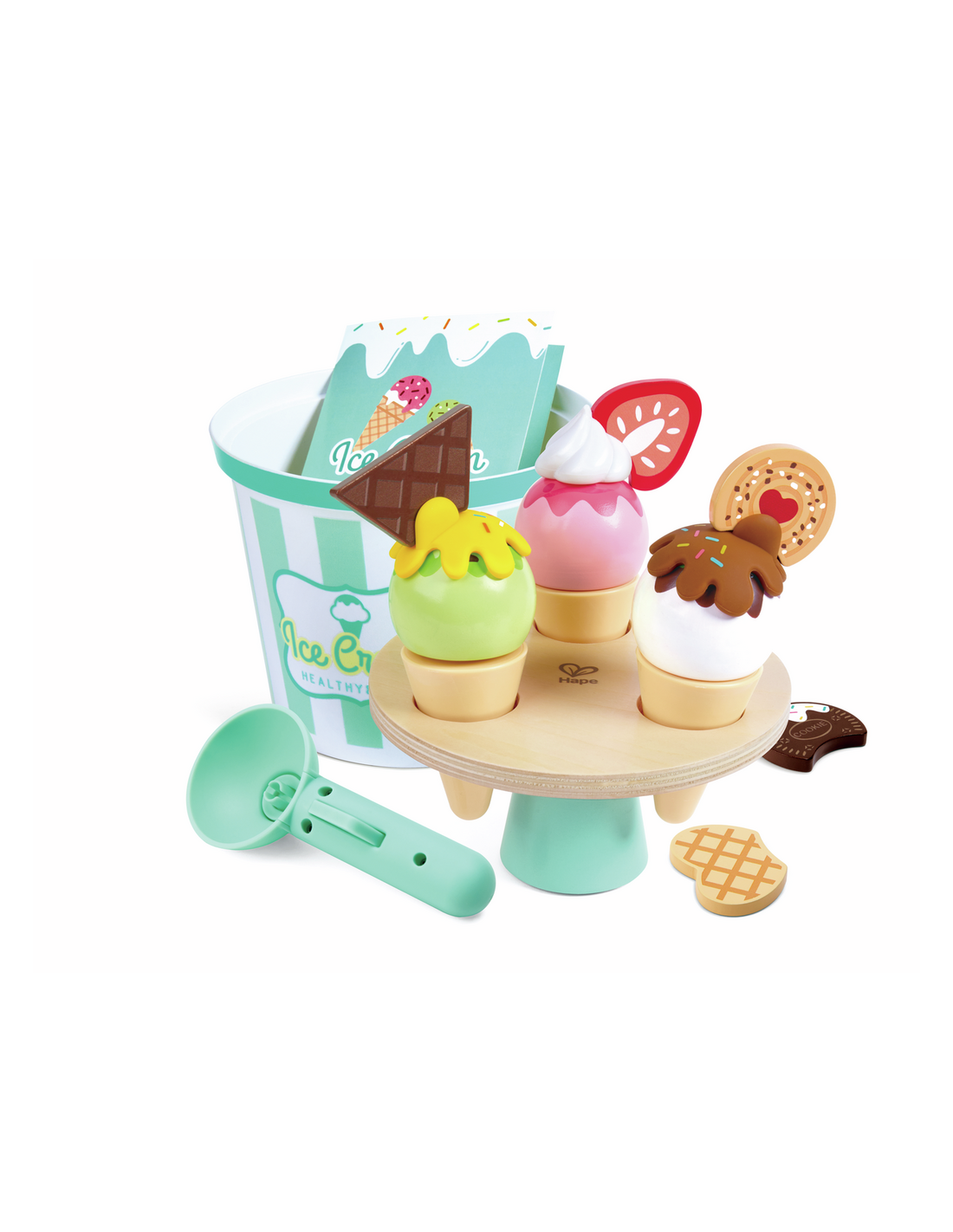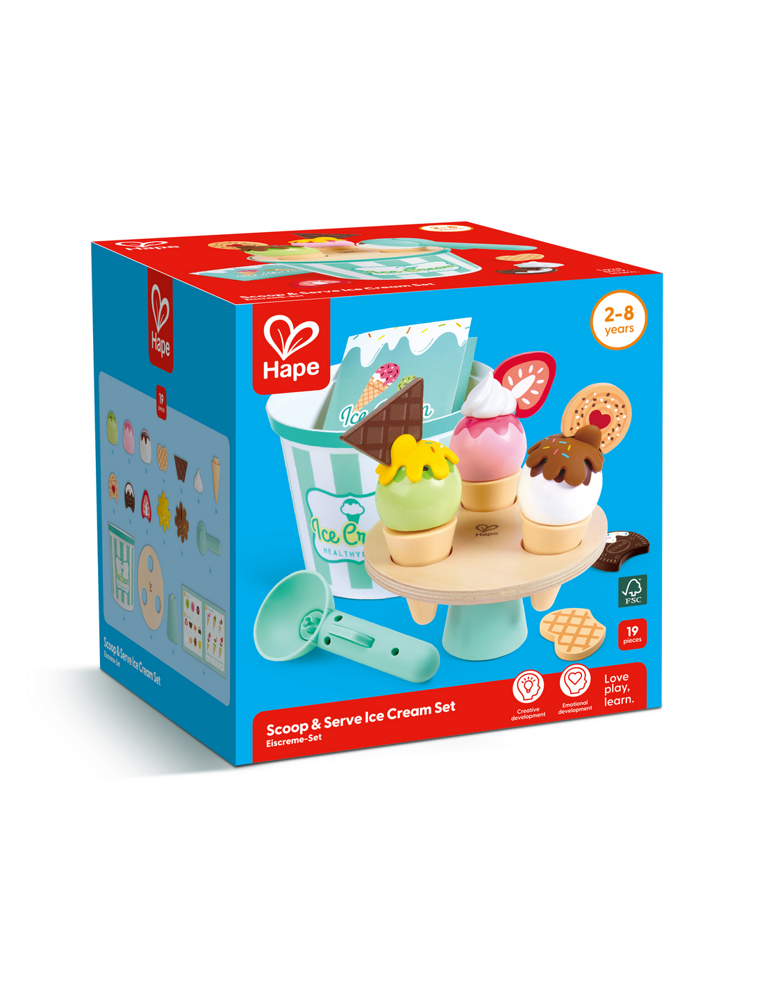 Amb el Joc de Gelat Scoop & Serve de Hape, els nens poden convertir-se en autèntics xefs de gelats, explorant la seva creativitat i jugant de manera imaginativa. Aquest set brillant i colorit els permet preparar les seves pròpies combinacions de gelat, barrejant sabors, cobertures i cons, mentre gaudeixen d'un joc pràctic i ple de diversió.