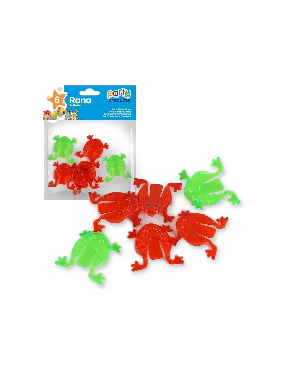 Conjunt de 6 granotes saltadores, transparents i de plàstic. Col•loca la granota a la seva posició natural i prem la seva cua. Quan la deixis, la granota farà un salt. Pots jugar a casa intentant posar les granotes dins d'una gerra, o intentar-les posar dins de l'estoig. En qualsevol cas, és un regalet molt divertit.