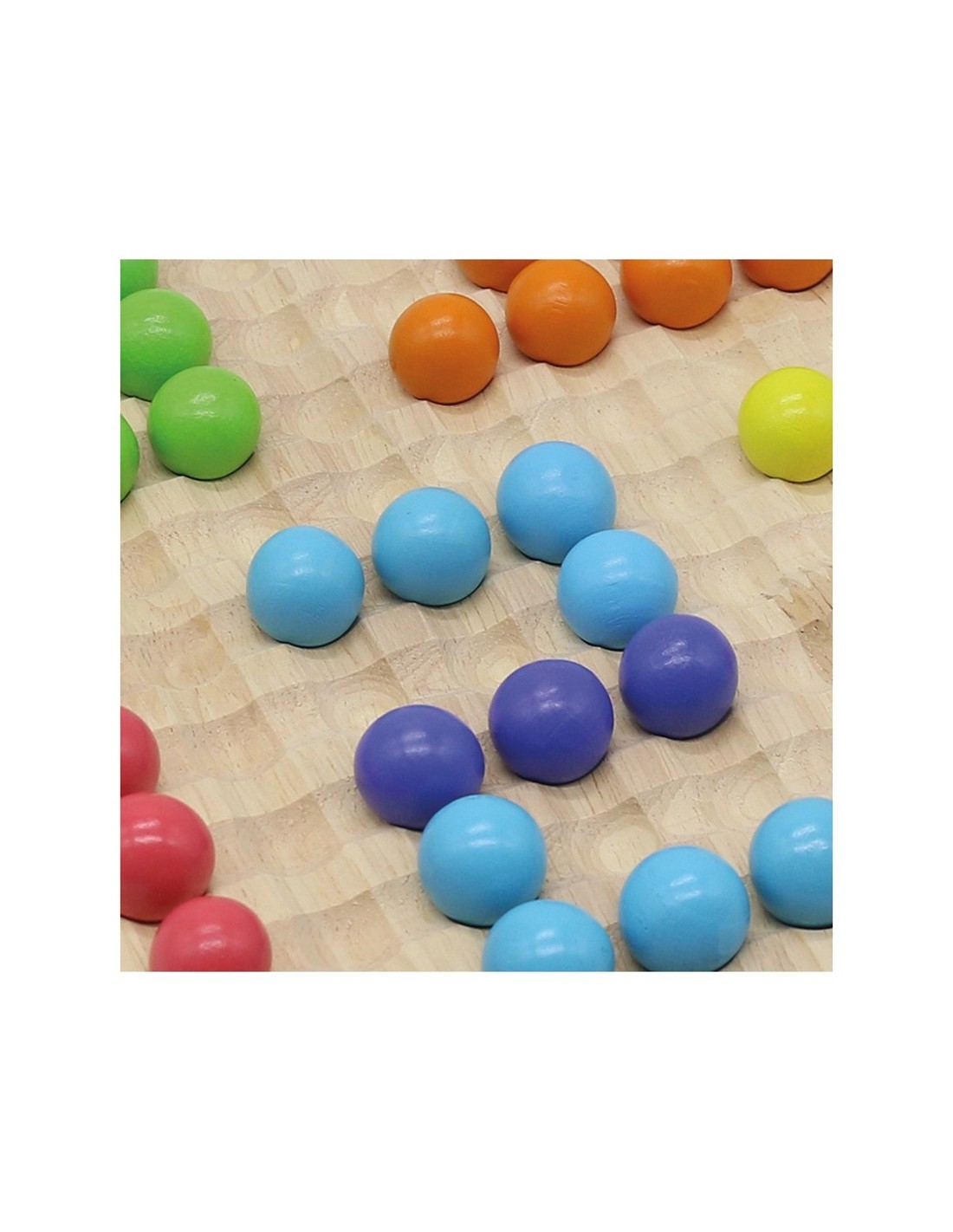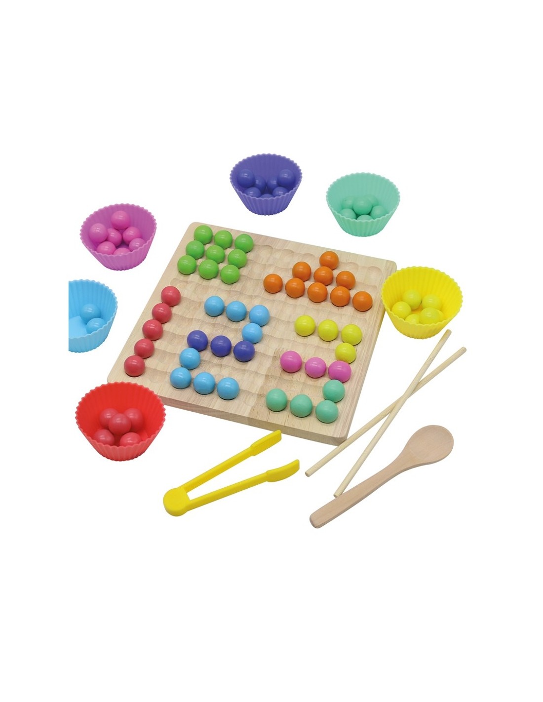 Joc de comptar amb comptes de fusta i pinces. Exercita la concentració, coordinació ull-mà, motricitat fina, comptar, classificar, combinar colors.