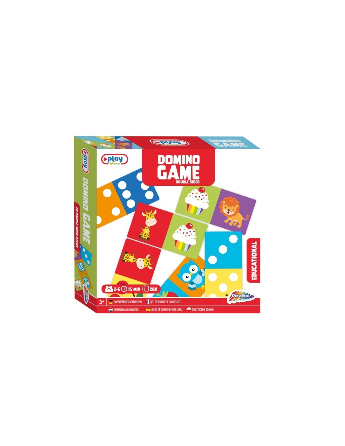 El joc del dominó infantil inclou 28 peces de doble cara perquè pugueu divertir-vos amb les diferents imatges que es mostren, o bé jugar amb les peces de dominó tradicionals, però a tot color. Una partida d'aquest joc del dominó infantil té una durada estimada de 15 minuts, un temps perfecte perquè no es faci ni molt curt ni molt llarg. A més, està recomanat perquè ho juguin de 2 a 6 persones, per la qual cosa es poden apuntar diversos membres de la família o amics.
