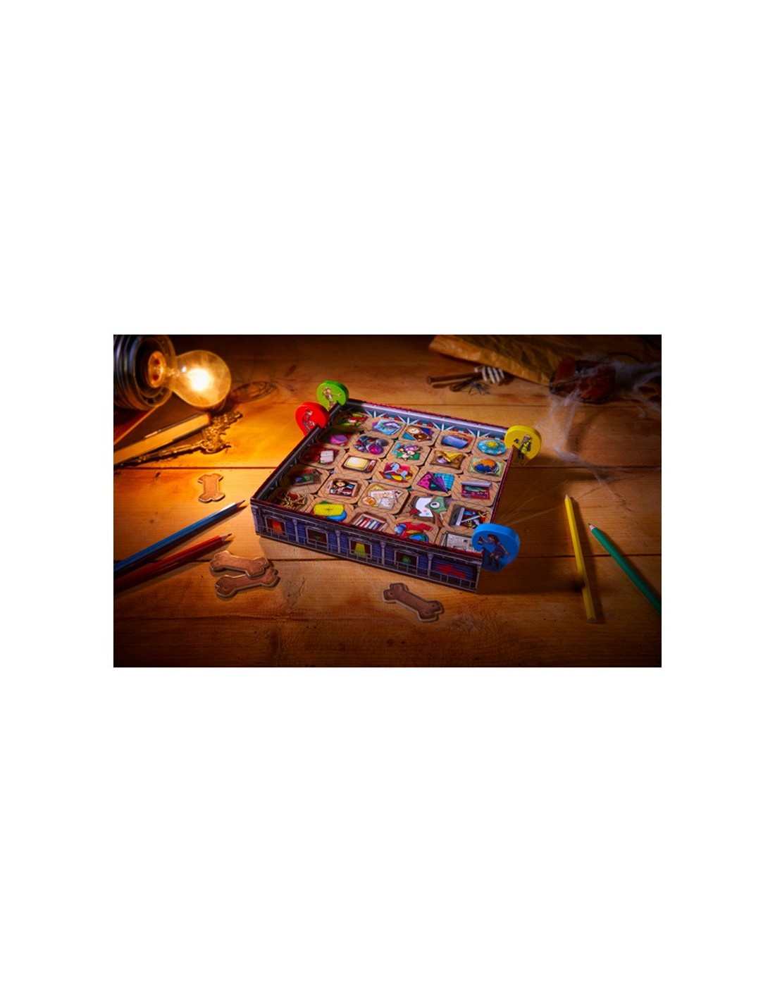 1 golfes (compost per: base de la caixa, làmina, quadre de 4 peces, 1 tauler-sòl, 1 tauler amb monstres, 24 fitxes d'objectes, 10 fulls blanques, 4 peces de joc, 4 llapis, 4 ossos, 1 instruccions del joc.