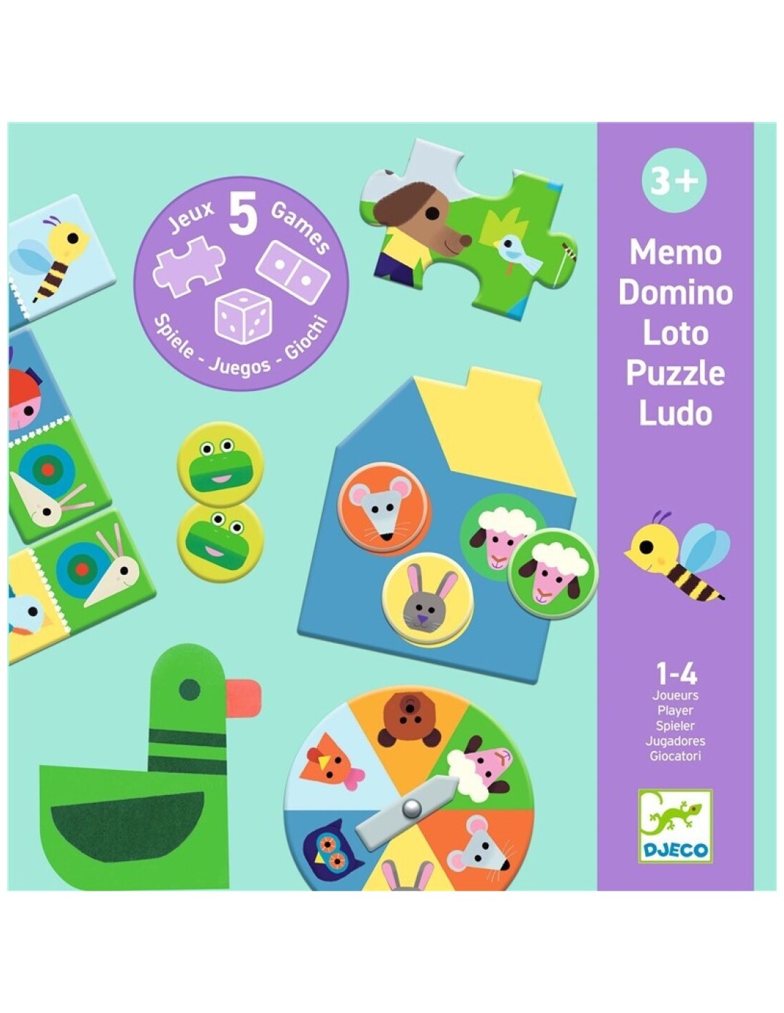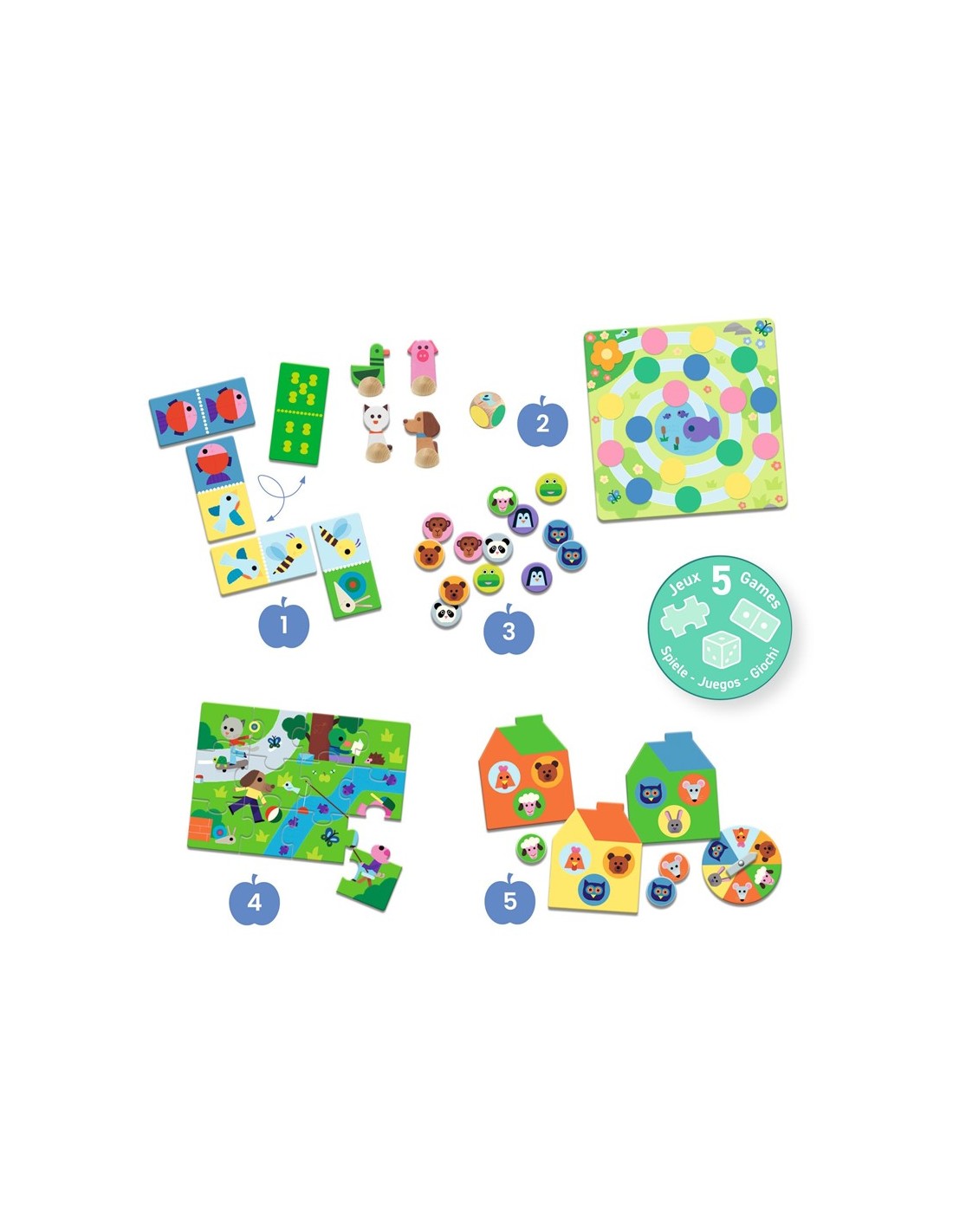 El lot inclou tot el necessari per a començar a jugar sense preparació addicional: 4 taulers siluetats, 1 roda giratòria, fitxes rodones per a loteria i memory, 28 peces de dominó, un tauler per al joc de recorregut, 4 fitxes de fusta i cartó, un dau de fusta i un puzle de 12 peces. Cada joc provoca una experiència distinta, permetent que el nen explori regles, dinàmiques i maneres de pensar molt variades.