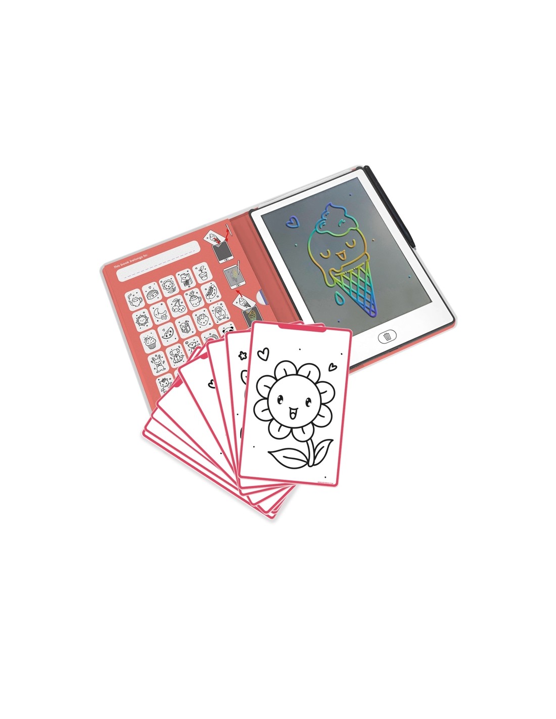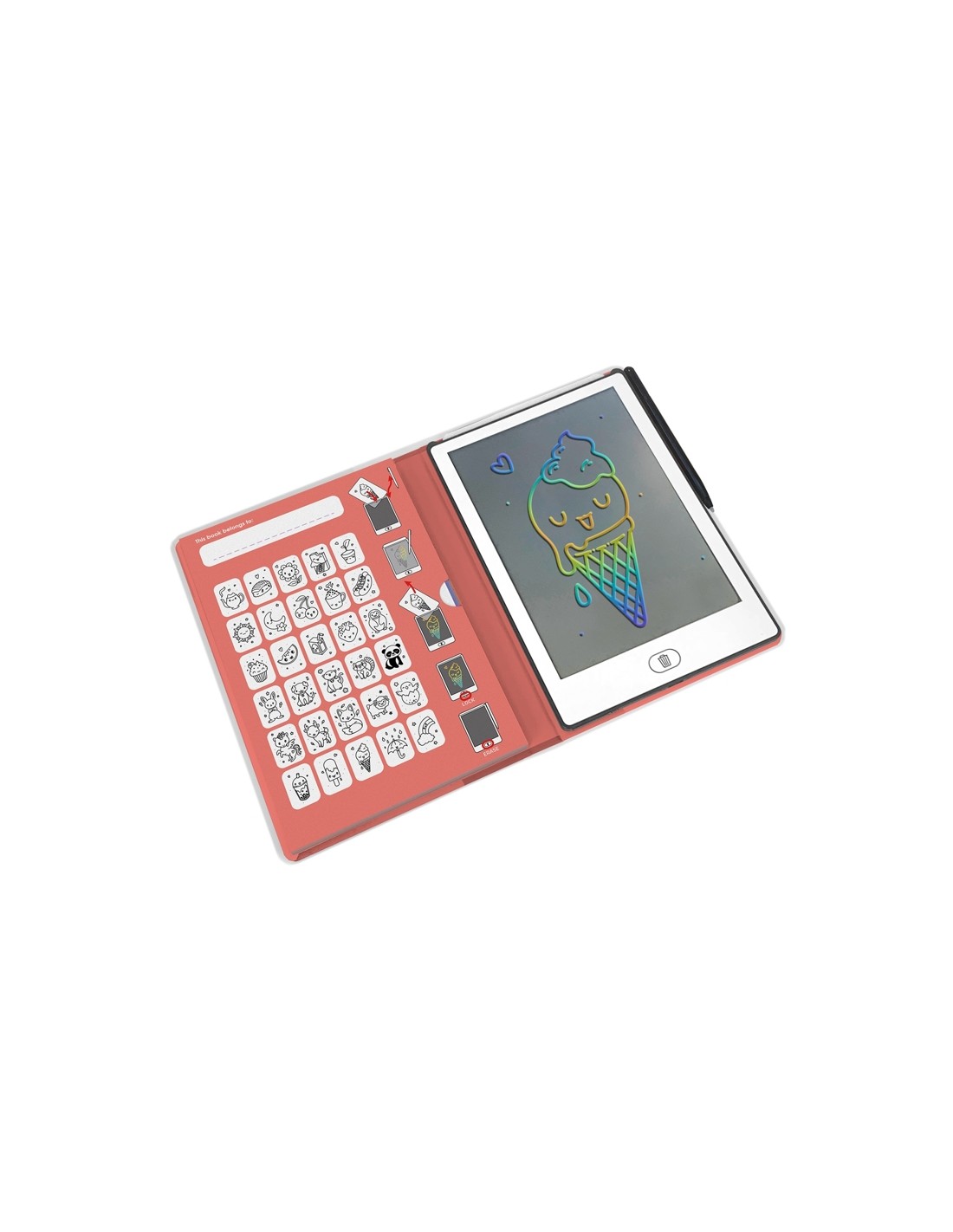 Aquest model compta amb una funda vermella decorada amb divertits dibuixos kawai que fa que el dispositiu sigui atractiu i divertit d'usar. Inclou 30 il·lustracions transferibles per tema i cada plantilla ofereix als nens la possibilitat de calcar i personalitzar els seus dibuixos, desenvolupant destreses motores fines, coordinació ull-mà i precisió.