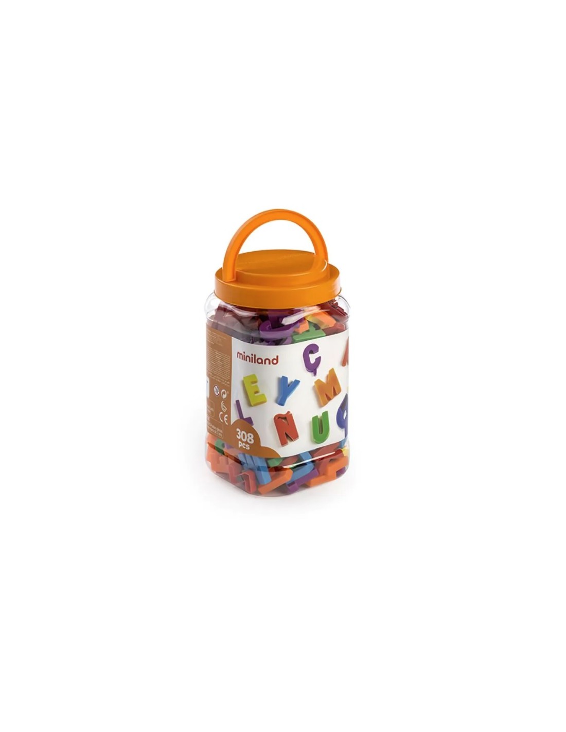 Complet assortiment de 308 lletres magnètiques majúscules, realitzades en plàstic de colors vius i molt resistents per a suportar cops i el tracte dels més petitons. Com són magnètiques, són perfectes per a utilitzar-les sobre pissarres metàl·liques.