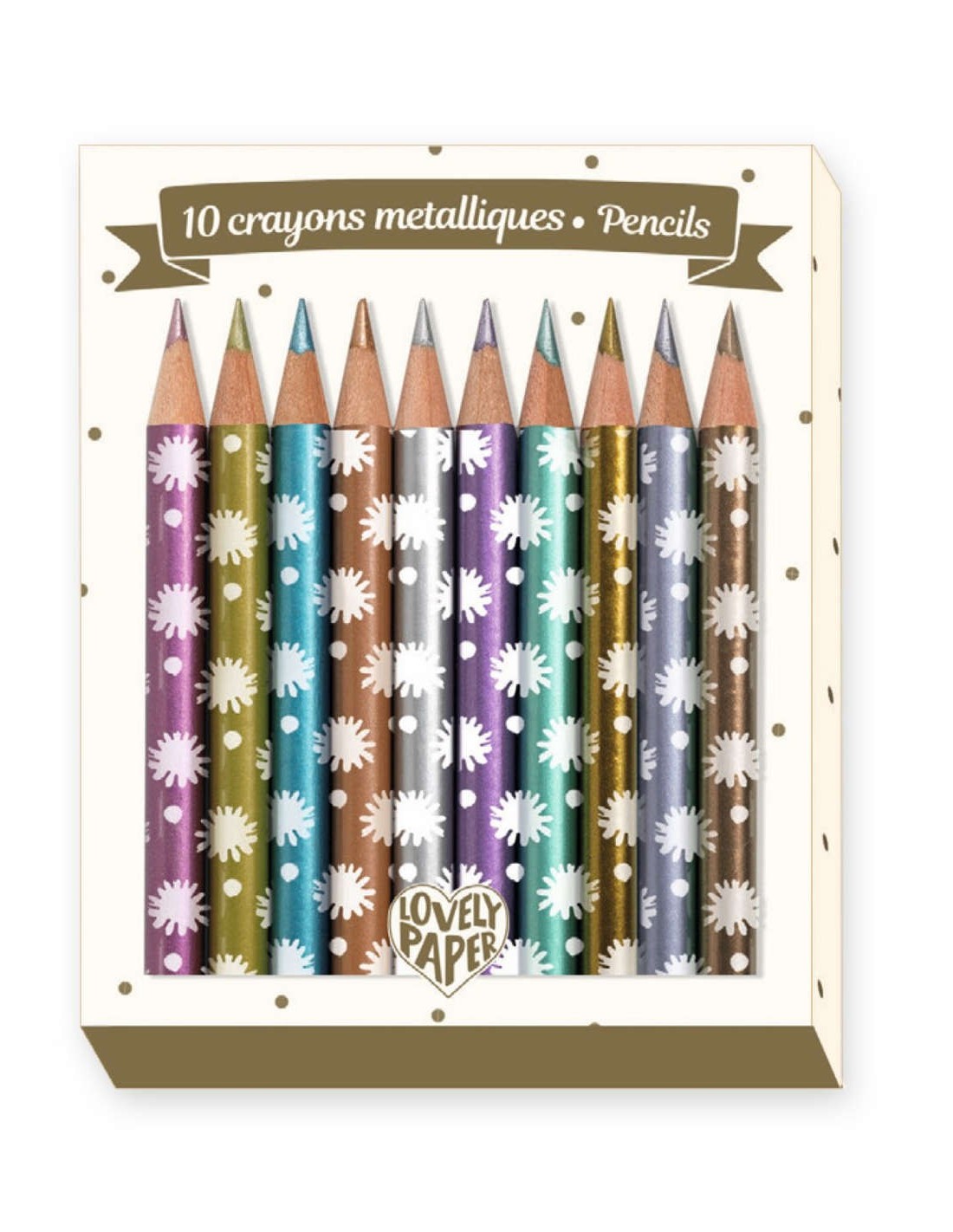 Lovely Paper, la nova col·lecció de papereria de Djeco, ens presenta aquest preciós conjunt de 10 Mini Llapis Chic. Es tracta d'un petit conjunt de llapis de colors metal·litzats, perfectes per emportar-te'ls on vulguis. Pinta els teus dibuixos amb aquest conjunt que complirà tots els teus desitjos. Hi ha molts colors diferents i cada llapis té un estampat diferent del color metal·litzat amb el que podràs pintar. Es serveixen dins d'una pràctica caixeta de cartró en la que podràs emmagatzemar-los una vegada hagis acabat. Genial!