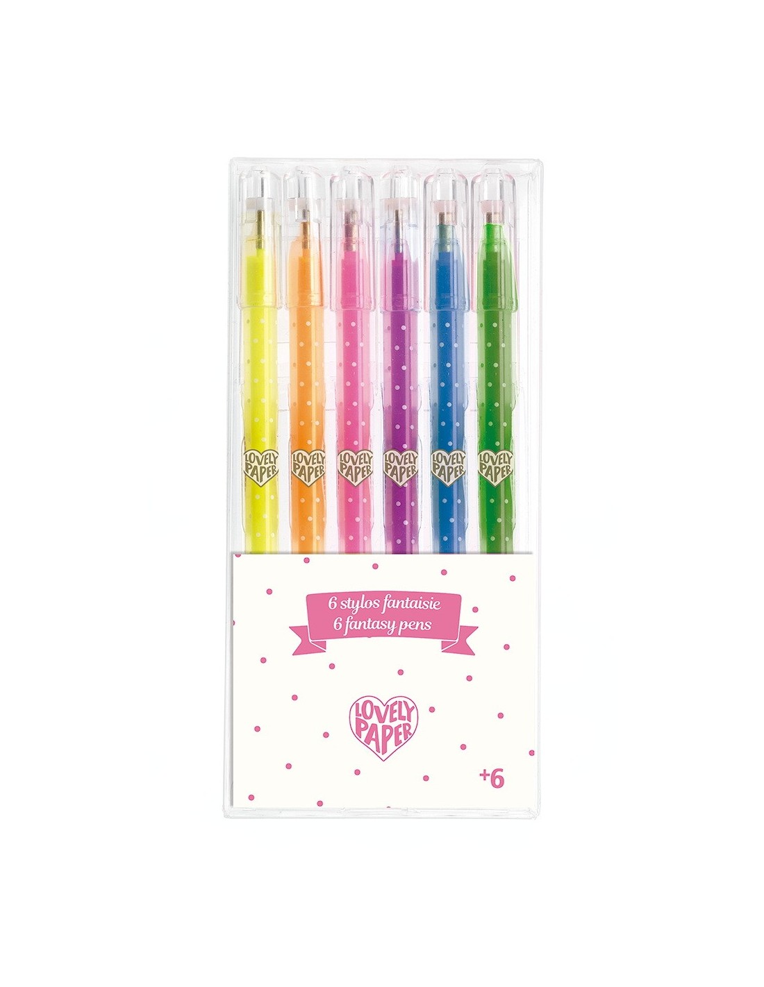 La col·lecció de papereria refinada Lovely Paper de la marca Djeco ens porta aquest kit de 6 bolígrafs de gel fluorescents. Com tots els elements d'aquesta col·lecció, els bolígrafs tenen una escriptura suau i constant que fa que siguin molt còmodes d'utilitzar. El pack inclou 6 colors dins d'una bossa transparent perquè puguis tenir-los sempre ordenats. Inclou els colors groc, taronja, rosa, morat, blau i verd. Un accessori de papereria molt interessant per a nens i adults que estimula l'escriptura creativa.