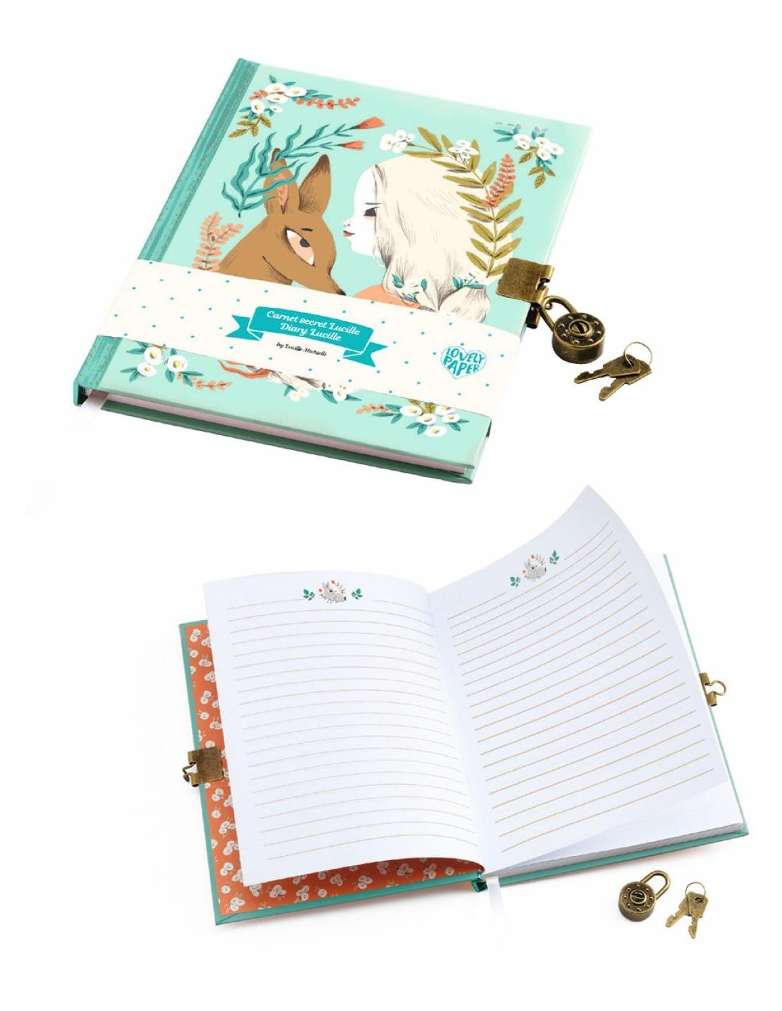 "Estimat diari, avui m'ha passat una cosa impressionant...". Expressa't i explica tots els teus secrets a aquest adorable diari de la Lucille. Les tapes són dures i al seu interior hi trobaràs una infinitat de pàgines en blanc amb ratlles horitzontals per escriure. A la portada hi ha una preciosa il·lustració de la Lucille, una atrevida noia, amb un cérvol. El diari inclou un candau que només s'obre amb dues claus, una per tu i l'altra per la persona que li tinguis més confiança. Ja has pensat a qui li donaràs? Un producte perfecte per millorar la teva expressió escrita i per coneixe't una mica millor.