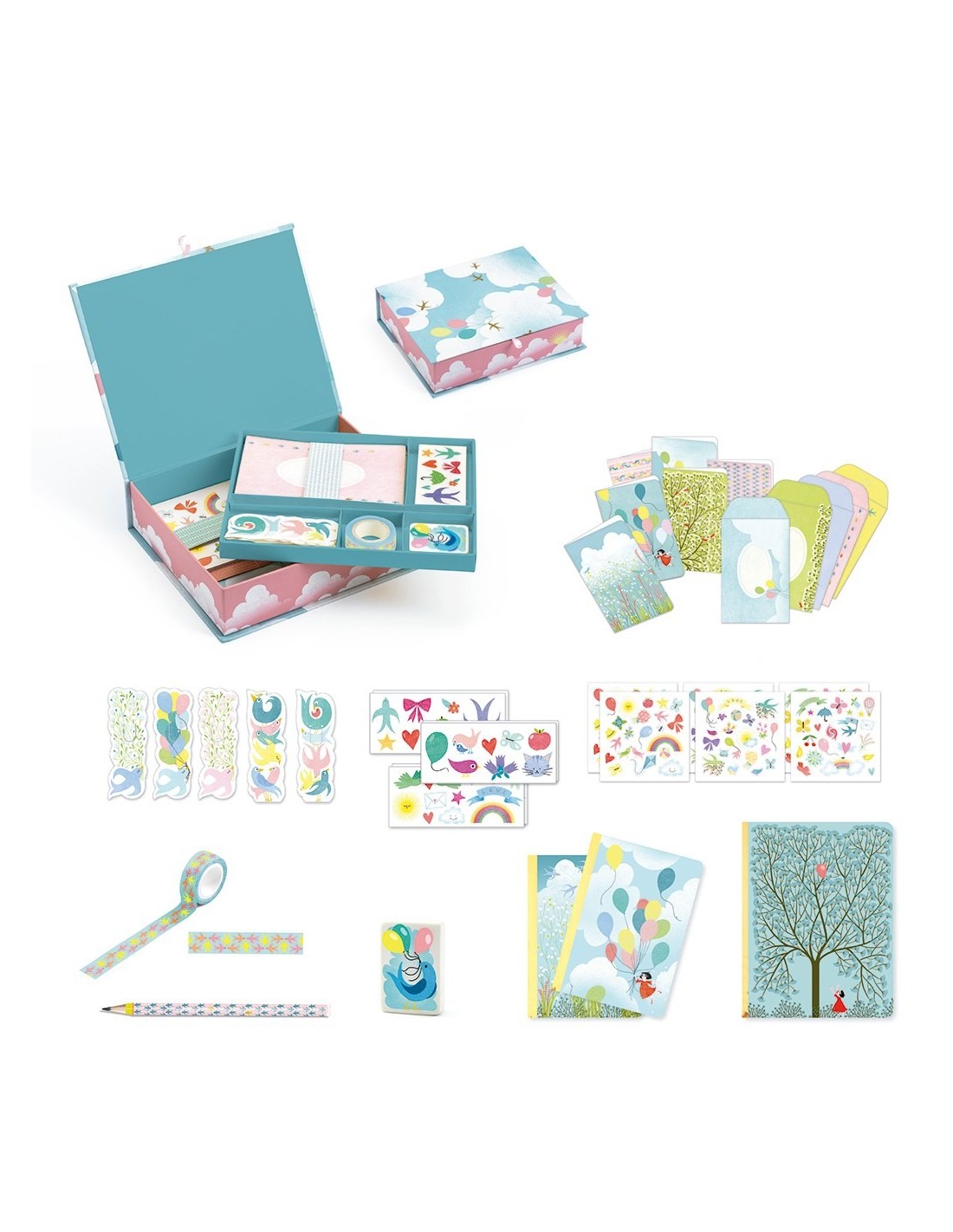 La col·lecció Lovely Paper de Djeco presenta aquest complet kit de papereria poètica i la seva preciosa caixa. Dissenyat amb il·lustracions de cel rosa i blau, la caixa té una safata extraïble i està pensada per ajudar a desenvolupar l'escriptura creativa i per escriure cartes als amics i amigues. La caixa conté els següents elements: - 1 llibreta - 2 quaderns - 5 punts de llibre - 6 fulls d'adhesius - 6 fullss de calcomanies - 10 cartes i sobres - 1 cinta adhesiva - 1 goma d'esborrar - 1 llapis - 1 caixa Dissenyat per Djeco per la il·lustradora Charlotte Gastaut, aquest estoig és un regal fantàstic per fomentar l'escriptura i les relacions socials.
