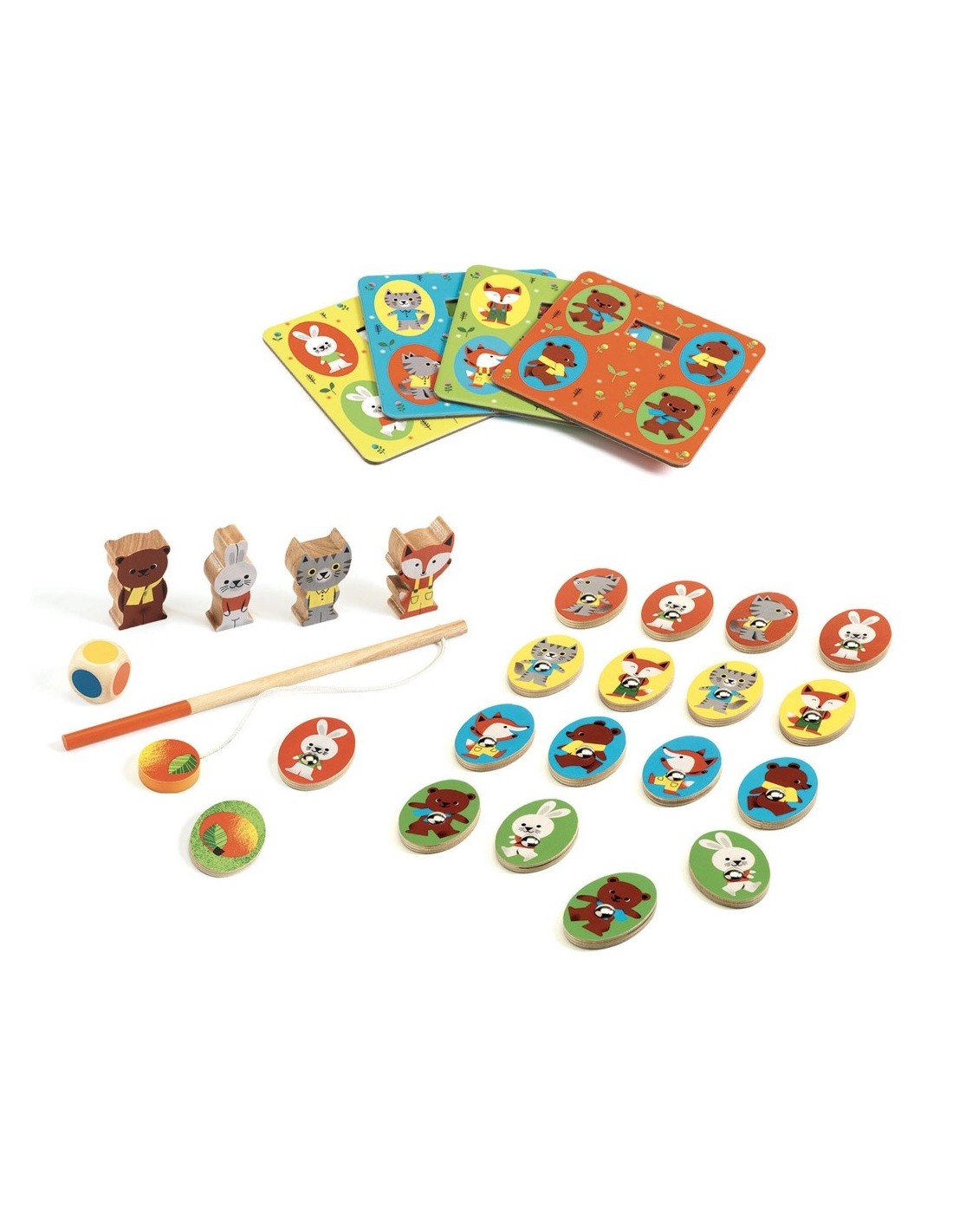 En tercer lloc, tenim el joc de PESCA, a partir d'un jugador: Col·loqueu les fitxes de fusta amb els animals en la caixa amb les imatges dels animals cap amunt. Cada jugador durant el seu torn intenta atrapar un animal amb una canya de pescar.