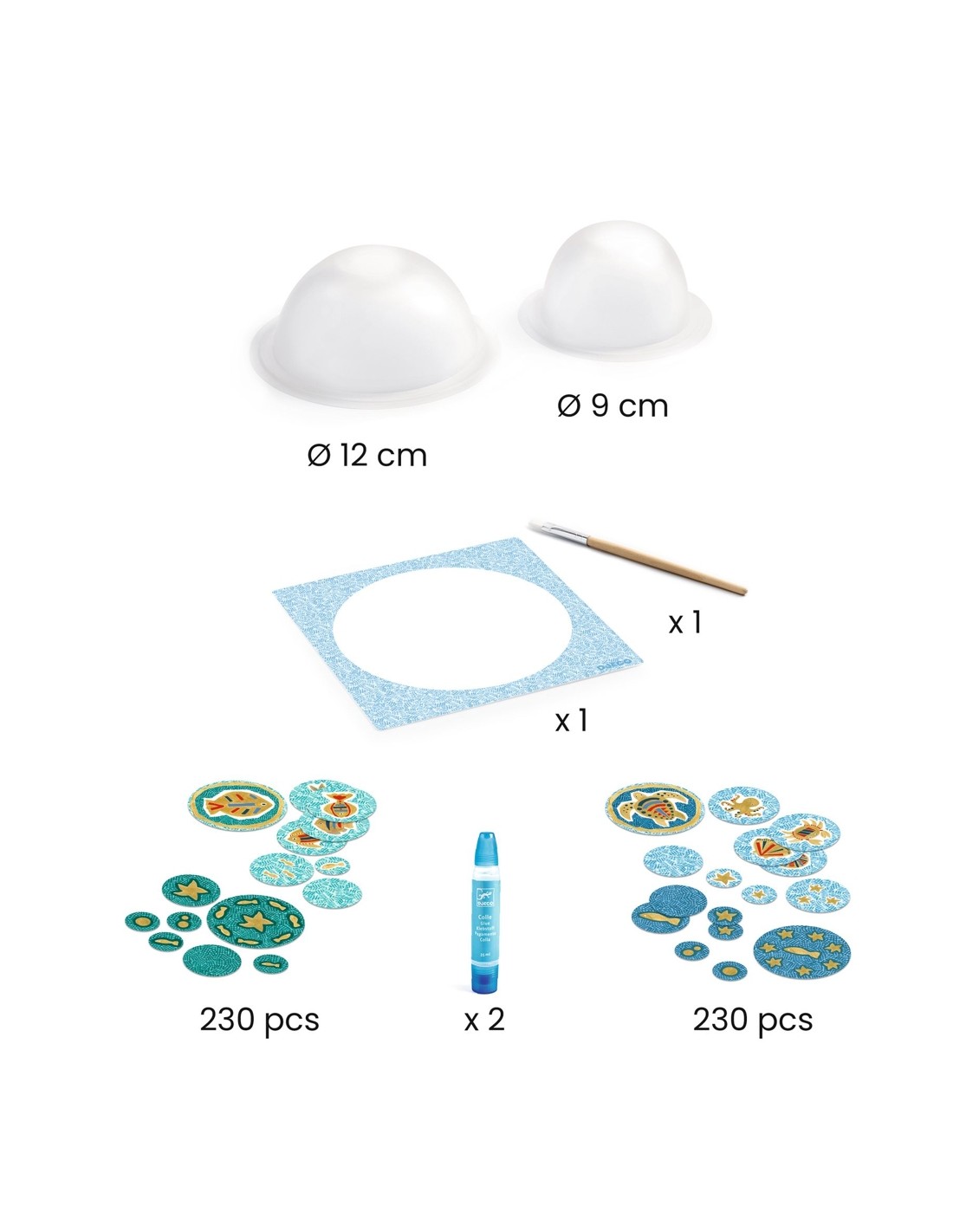 El contingut del kit proporciona tot el necessari per a l'aventura artística, inclosos dos bols, dos tubs de cola líquida, una paleta, una brotxa i confeti de paper il·lustrat gran. Cada element ha estat acuradament seleccionat per a garantir que els nens tinguin accés als materials adequats per a expressar la seva imaginació i crear peces decoratives sorprenents. Amb aquesta manualitat del mar, els nens tindran tot el necessari per a crear obres mestres inspirades en l'oceà.