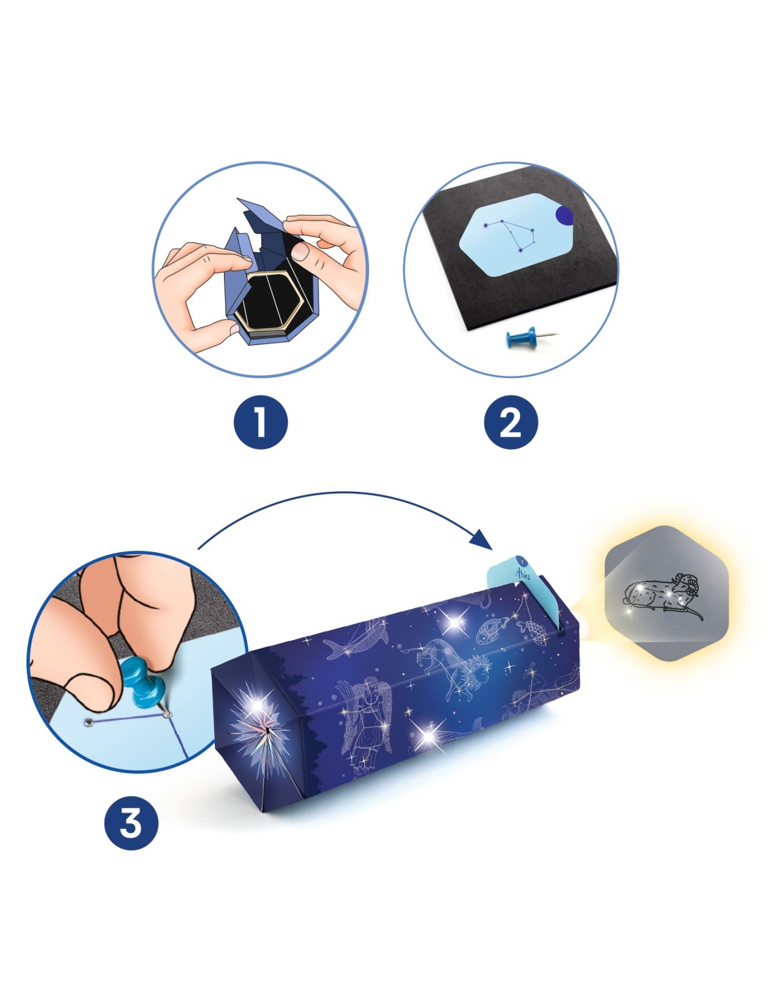 Una vegada acabat, el projector permet observar il·lustracions de constel·lacions en una habitació a les fosques, un moment màgic que els nens poden compartir amb família o amics. Aquest aspecte del set fomenta no sols la creativitat i la imaginació, sinó també el joc col·laboratiu i l'exploració científica en grup. A més, a mesura que observen les constel·lacions i aprenen a identificar-les, els nens desenvolupen la seva comprensió espacial i el seu coneixement sobre el cosmos, una manera divertida i educativa de despertar el seu interès per la ciència.