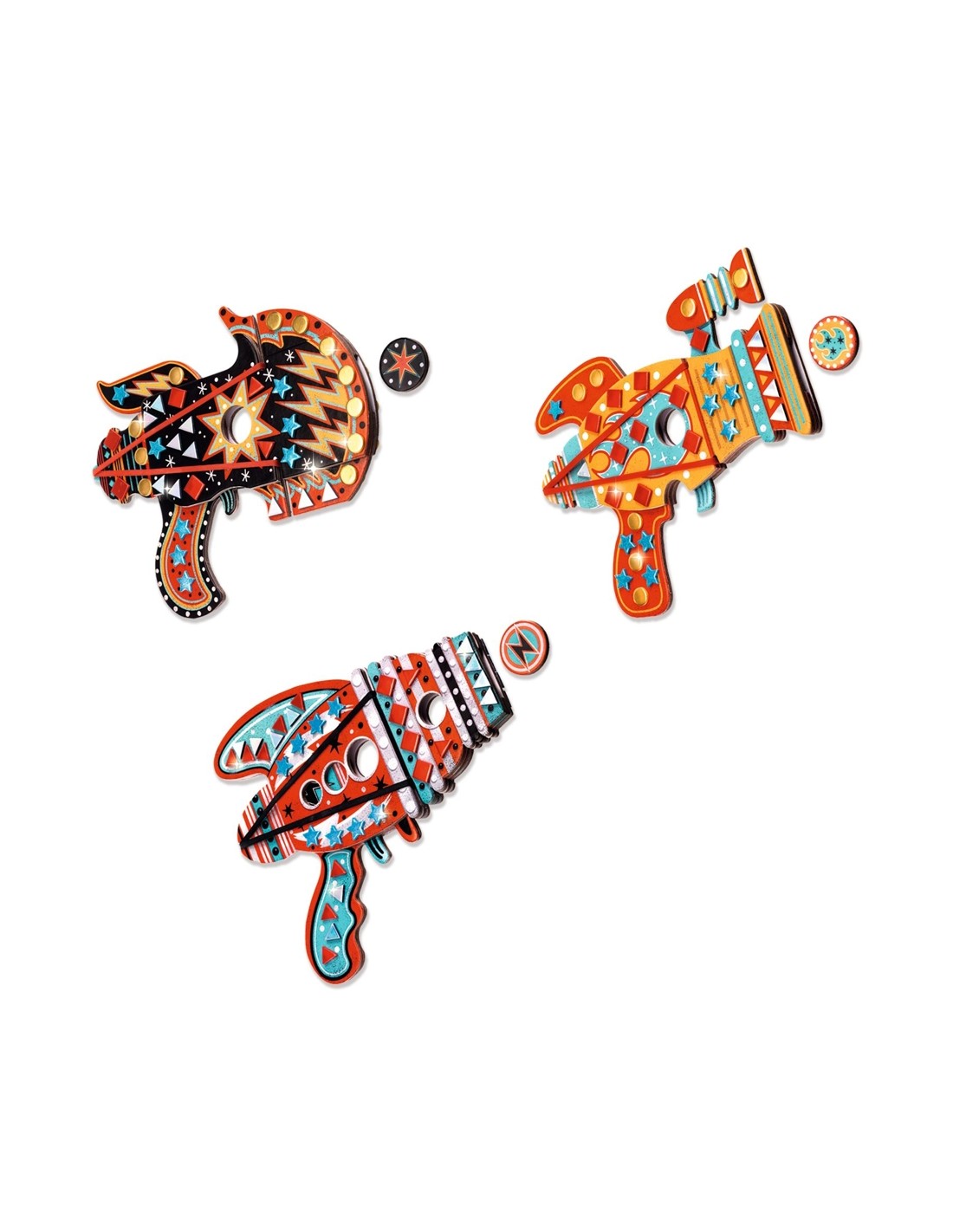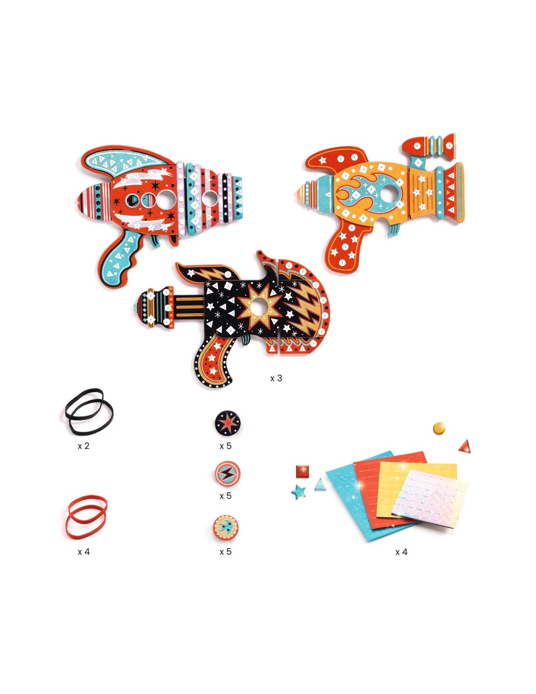 Fes els teus propis llançadors còsmics amb aquesta manualitat DIY de la marca francesa Djeco. Primer, decora'ls amb els mosaics metàl·lics i els adhesius d'escuma que s'inclouen, després, quan estiguis llest, comença una missió per a conquistar la galàxia!
