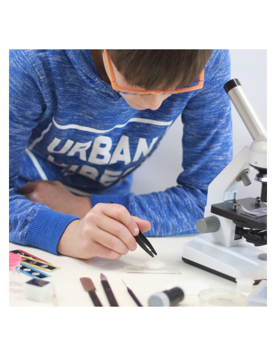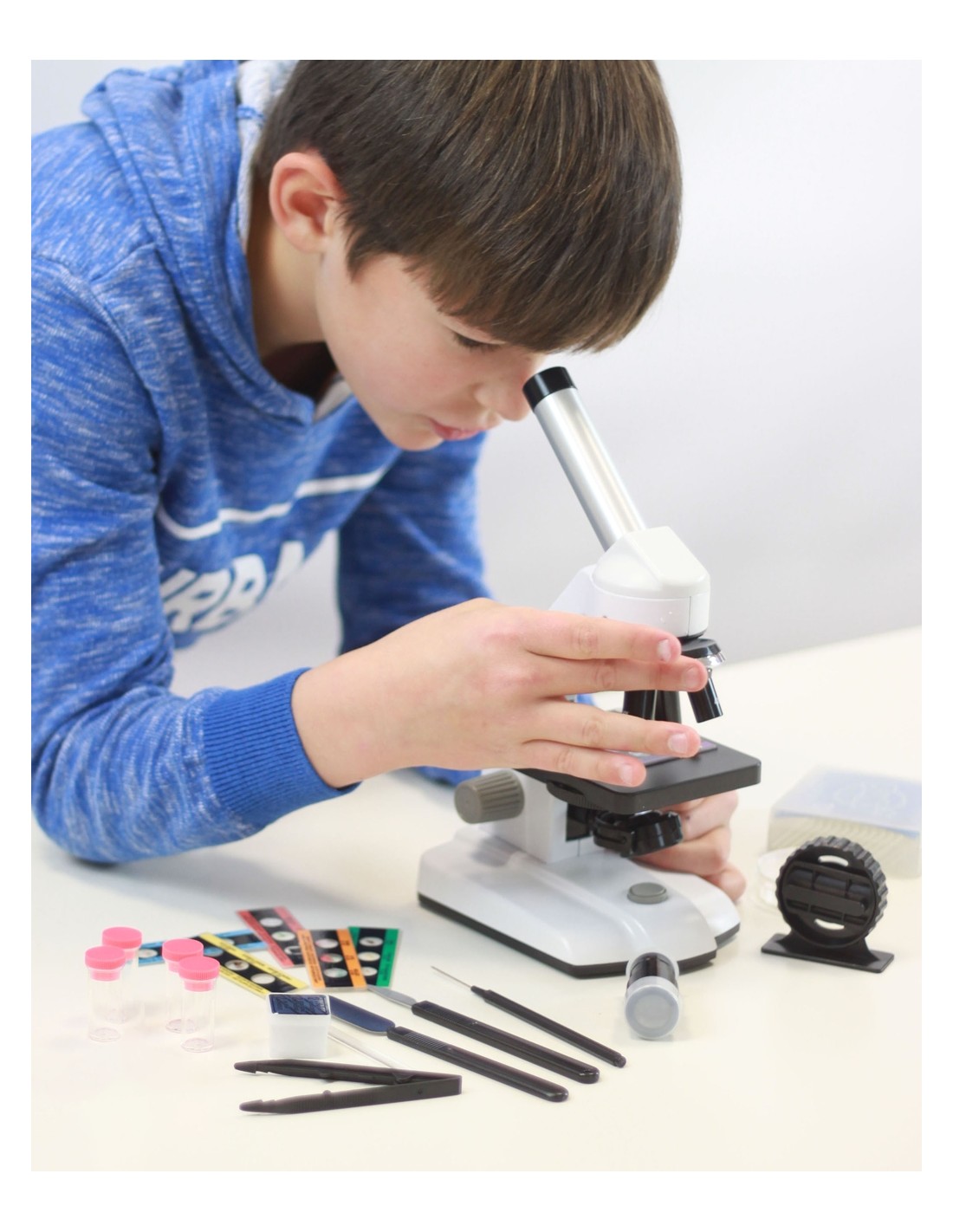 El kit inclou una àmplia selecció d'accessoris i materials pensats per a fer experiments variats des del primer dia. Entre ells es troben portaobjectes, vials, pinces, plaques Petri, mesclador, retroil·luminador, i fins a un microtallador que permet preparar petites mostres de manera còmoda. Tots els elements estan dissenyats perquè els usuaris puguin aprendre a preparar, manipular i analitzar mostres, igual que en un laboratori real.