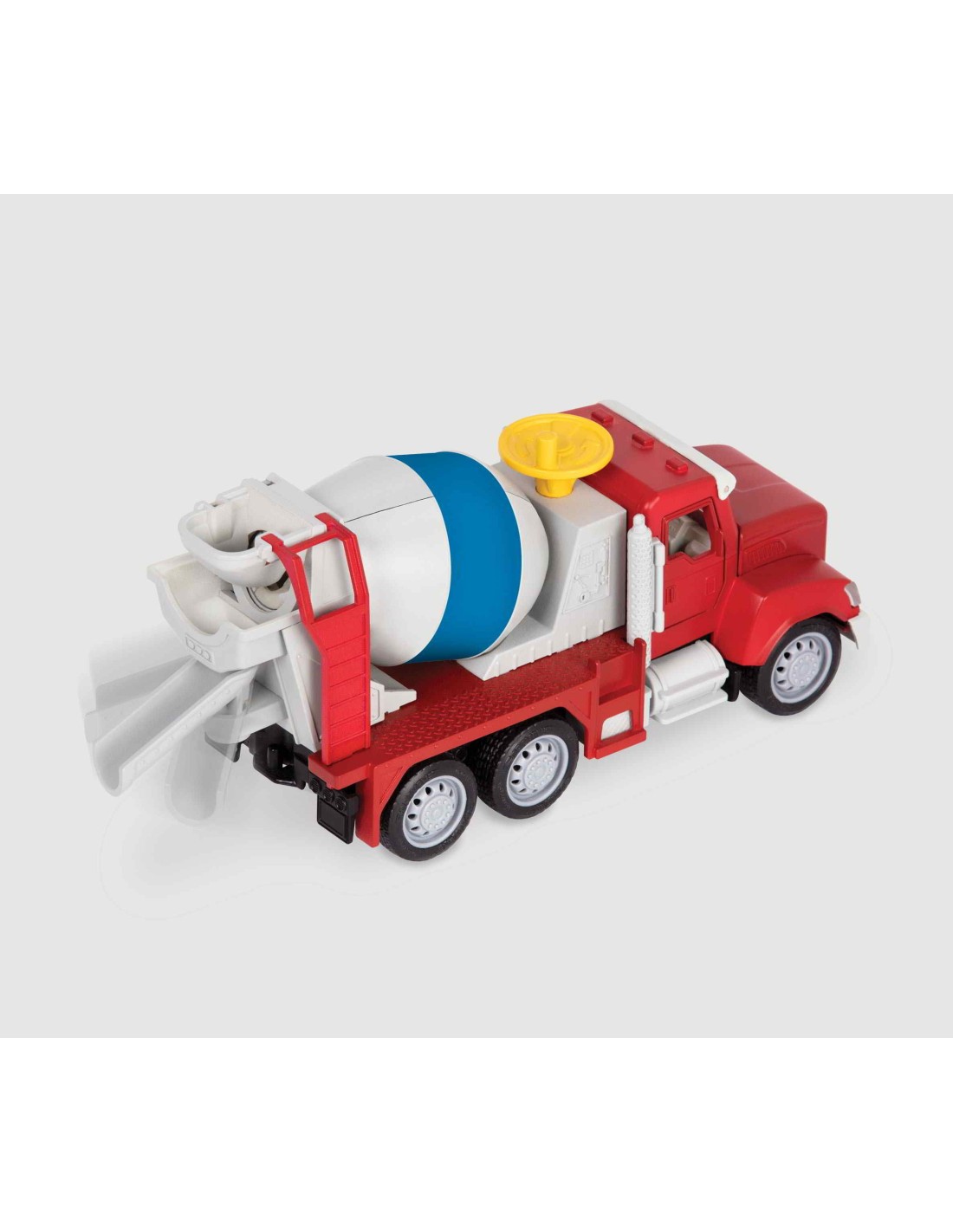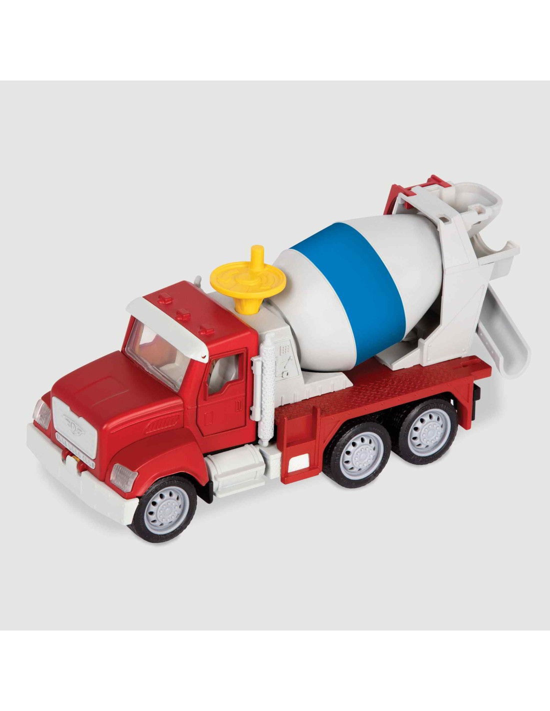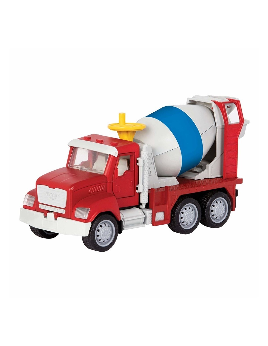 Aquest mini camió formigonera de la marca Driven té unes mesures de 18 cm x 9,5 cm x 7 cm i necessita 3 piles AG13.