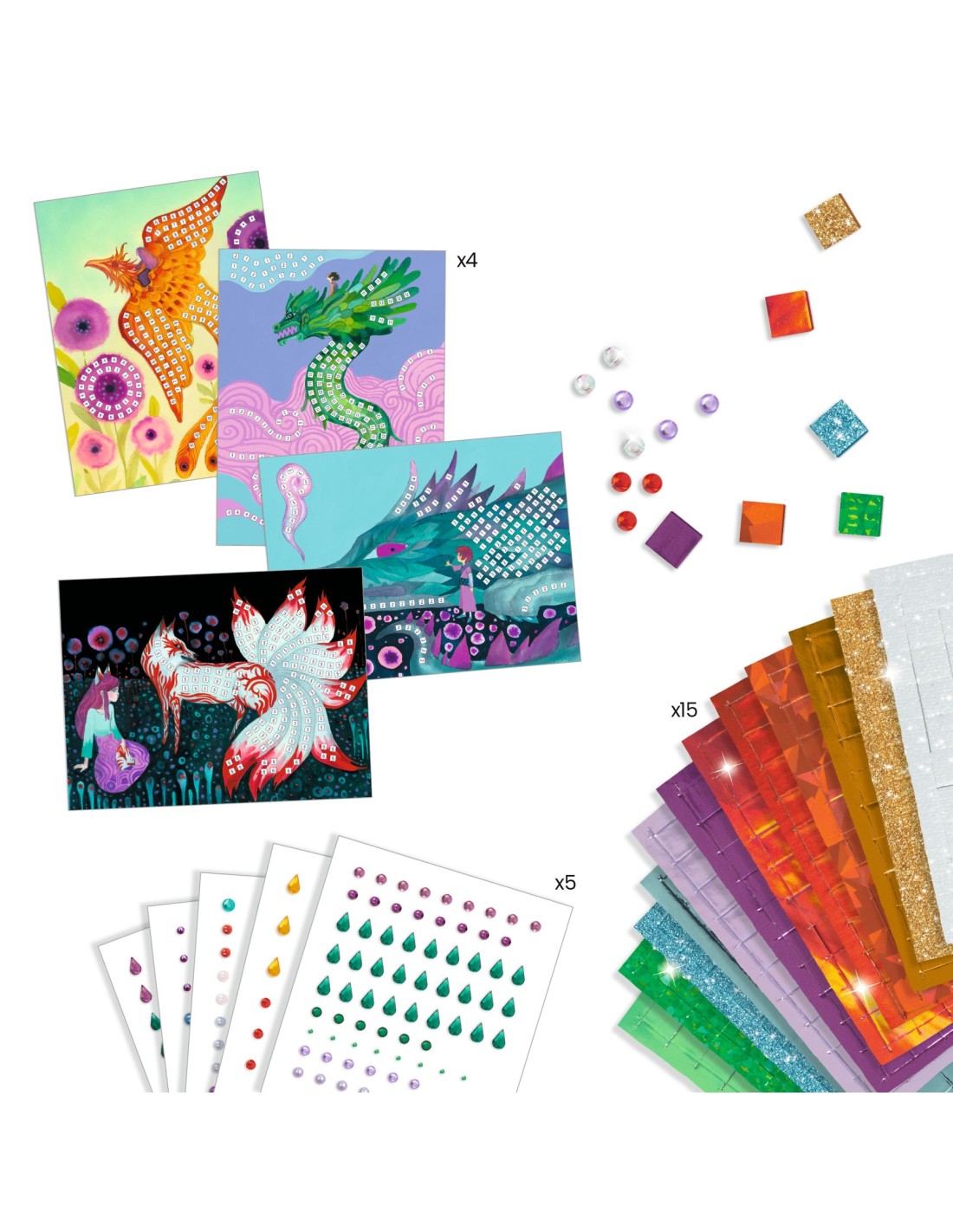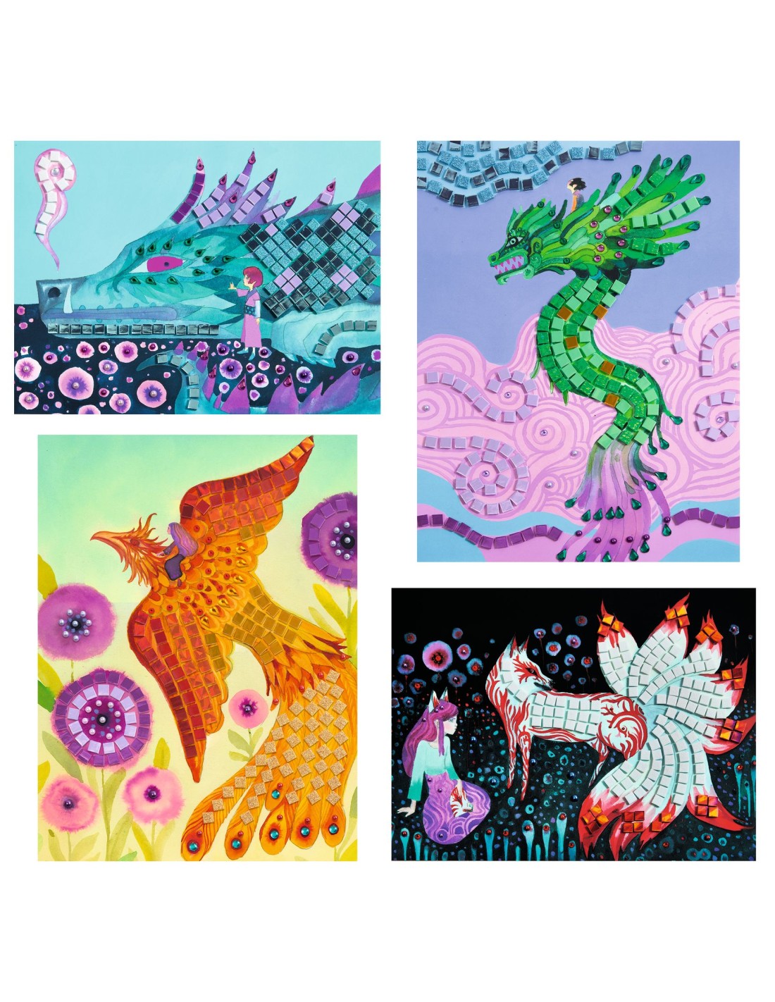 A més, l'ús de materials com les gemmes adhesives i les làmines de purpurina aporta un toc de màgia i fantasia a l'activitat, la qual cosa estimula la creativitat i la imaginació dels nens. En veure com els seus mosaics cobren vida, els nens poden experimentar un gran sentit d'assoliment, la qual cosa reforça la seva confiança i autoestima. Les il·lustracions inspirades en dracs i criatures mítiques també fomenten l'interès per històries i llegendes, ampliant els seus coneixements culturals i ajudant a despertar la seva curiositat pel món que els envolta.