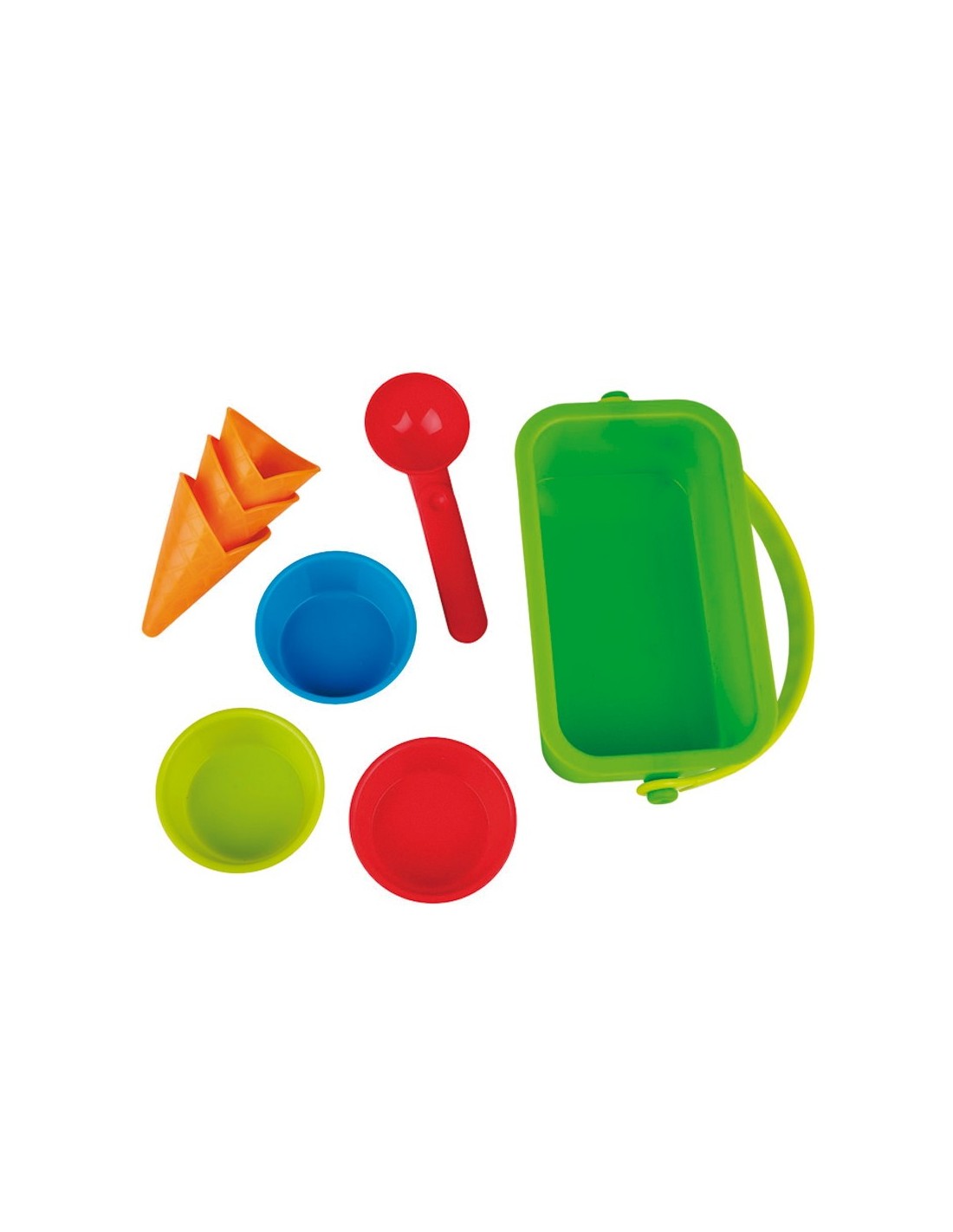 Fantàstics motlles de gelateria, perquè els més menuts se sentin realment com uns mestres gelaters. Fàcils d'utilitzar, amb cullera de sorra inclosa, i així servir els gelats com més agradi. També tres motlles de con i tres de got on poder posar els seus desitjables gelats, i finalment la galleda per poder omplir del sabor que més els agradi!