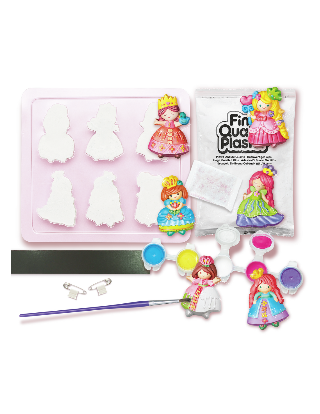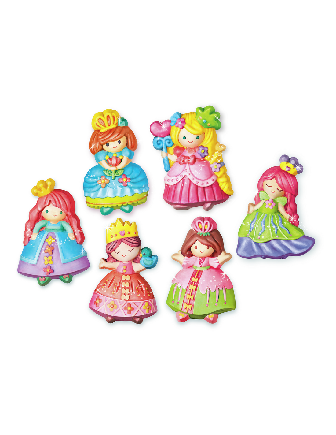Crea els teus pins, imants o figuretes de brillants i boniques princeses. Aquest paquet conté tot el necessari per crear i decorar fins a 6 figuretes: 1 motlle amb 6 dissenys, pintures, brillantor, 6 imants, 2 pins, un pinzell, pasta emmotlladora d'alta qualitat i instruccions detallades.