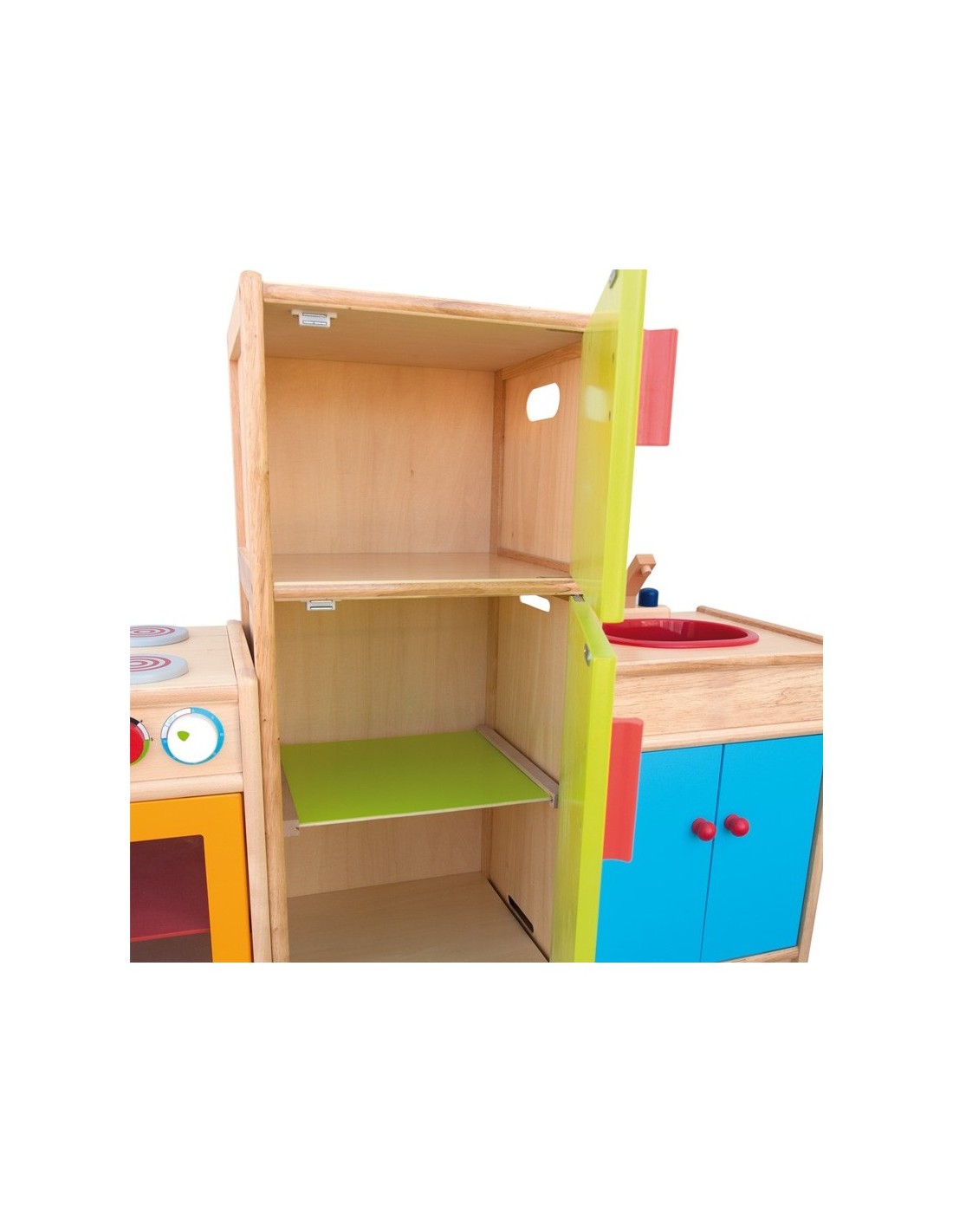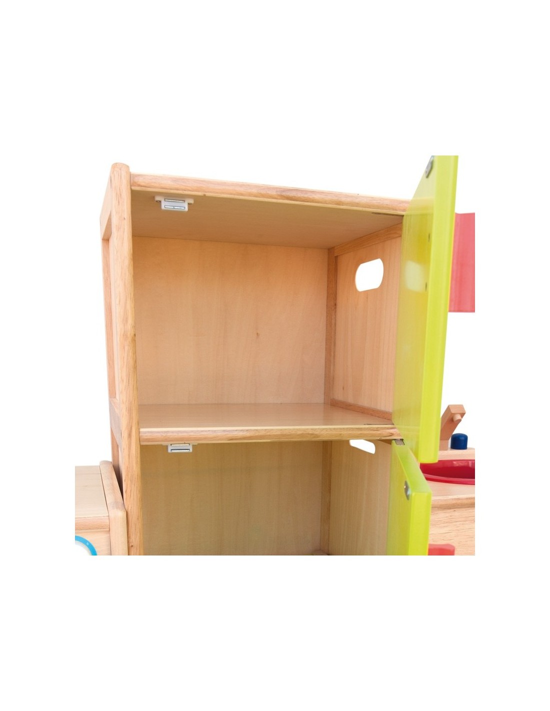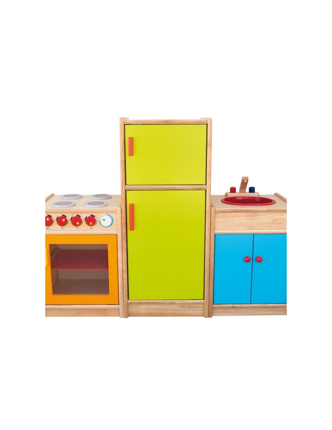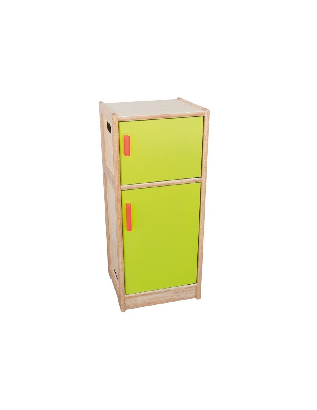 Nevera de joguina feta de fusta natural envernissada. Les dues portes de la nevera estan pintades de color verd clar, donant-li, així, un caràcter més divertit. Té dos compartiments diferents: la nevera (part inferior) i el frigorífic (part superior). Podràs guardar totes les teves fruites, verdures, pastissos i productes a dins. D'aquesta forma, ho tindràs tot ordenat per quan vulguis tornar a jugar.