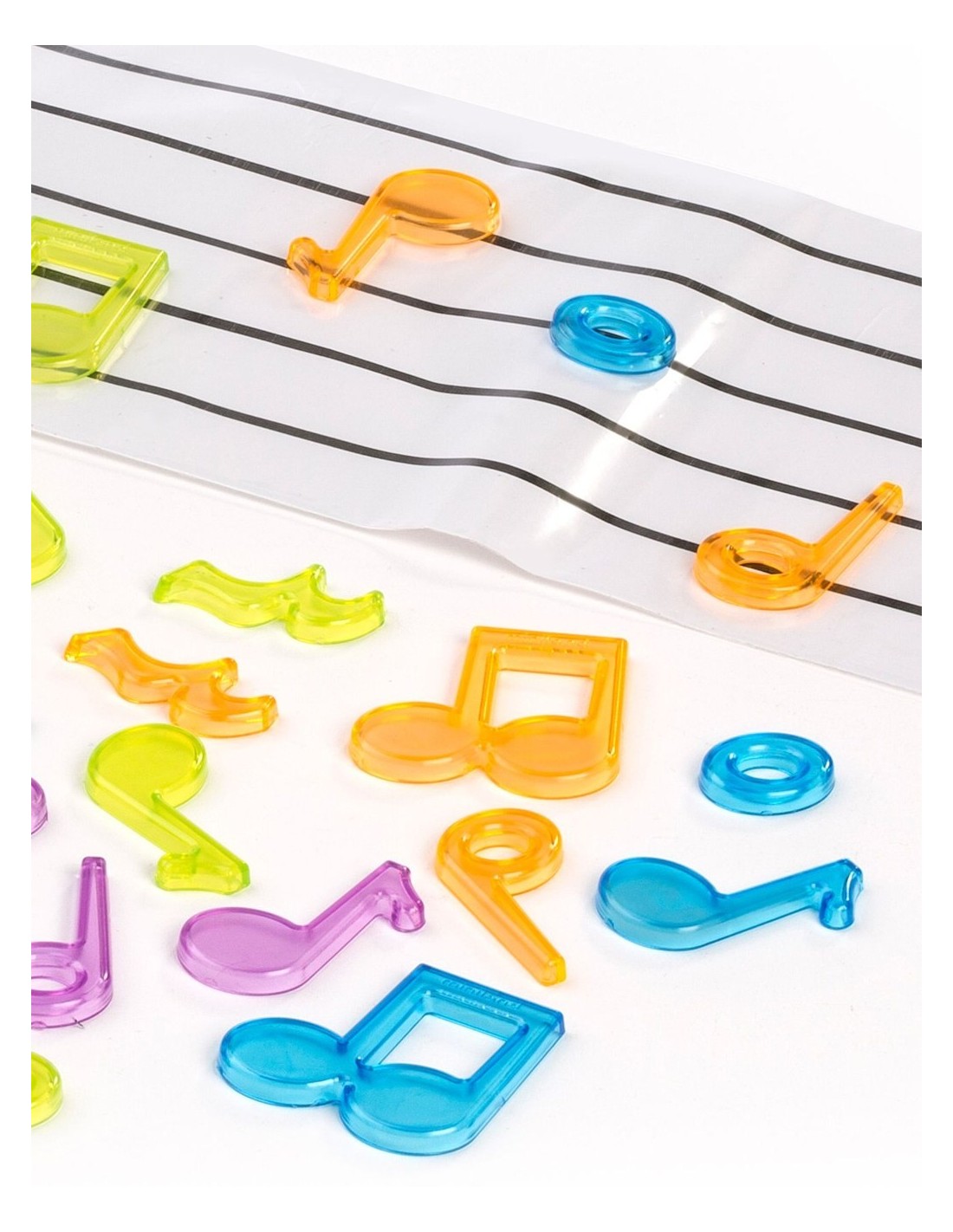 Aquesta joguina consisteix en un conjunt de 96 notes musicals translúcides en diversos colors i diferents formes. La grandària mitjana de les notes és de 4 centímetres d'alt i el del pentagrama és de 40 centímetres de llarg. Amb aquest joc, els nens i nenes aprendran d'una forma divertida a reconèixer, diferenciar i classificar les principals notes musicals. Inclou un pentagrama transparent, que és molt útil per a introduir als nens al llenguatge musical.Perquè aprenentatge i joc van de la mà!