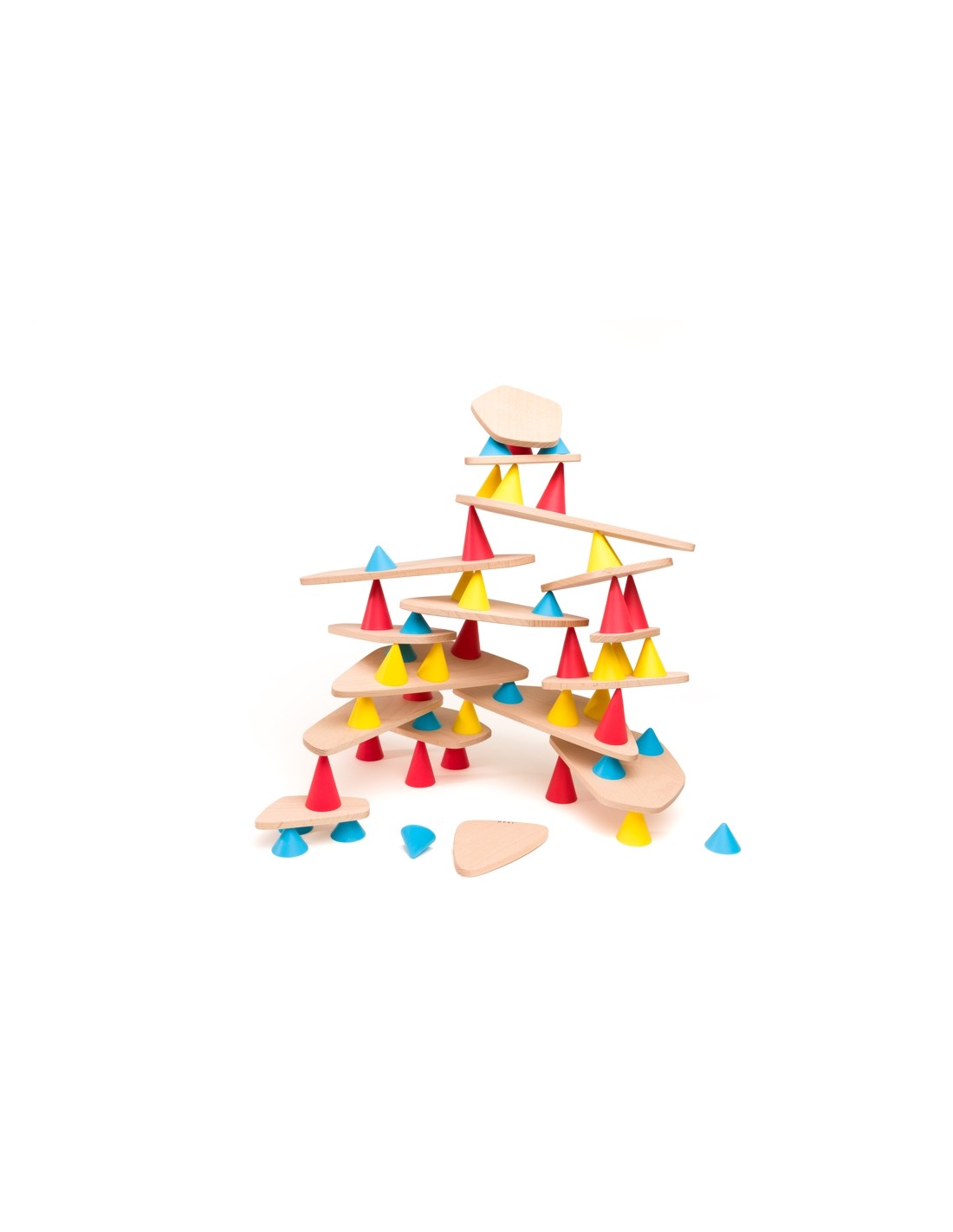 El joc inclou 48 cons de silicona en tres grandàries, 16 taulons de faig, una bossa de cotó per a guardar el material i un fullet d'instruccions amb exemples de targetes creatives per a inspirar noves construccions. És un joc versàtil que combina diversió i aprenentatge mentre els nens experimenten amb l'equilibri i la coordinació.