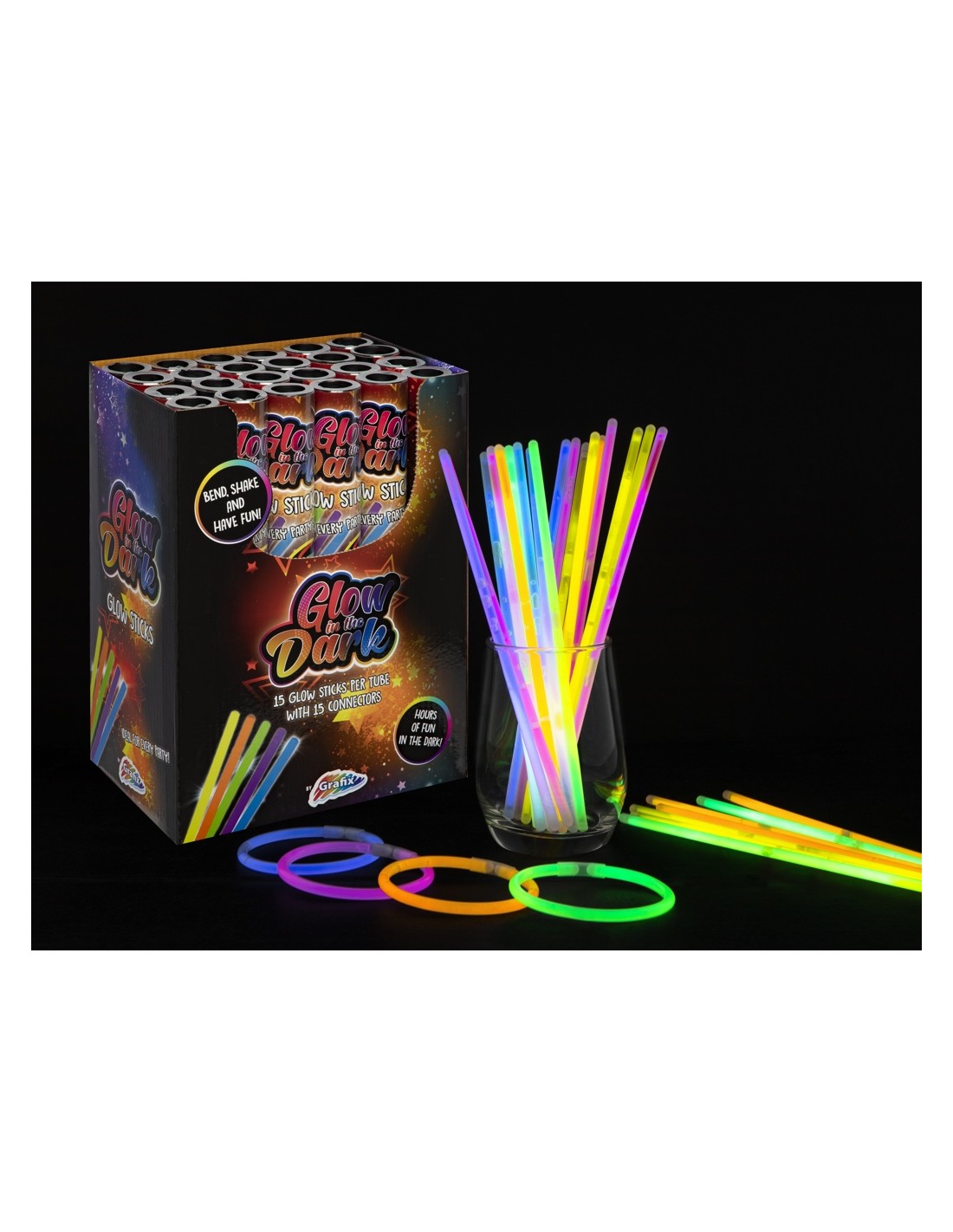 Els pals que brillen en la foscor són una forma màgica i divertida d'il·luminar qualsevol ocasió especial. Aquest tub conté 15 barretes lluminoses en cinc colors, que faran que els nens es meravellin amb l'espectacle de llums que poden crear. Cada pal, en activar-se, emet una lluentor intensa que dura hores, convertint-se en l'accessori perfecte per a festes, esdeveniments nocturns, o simplement per a jugar en la foscor.