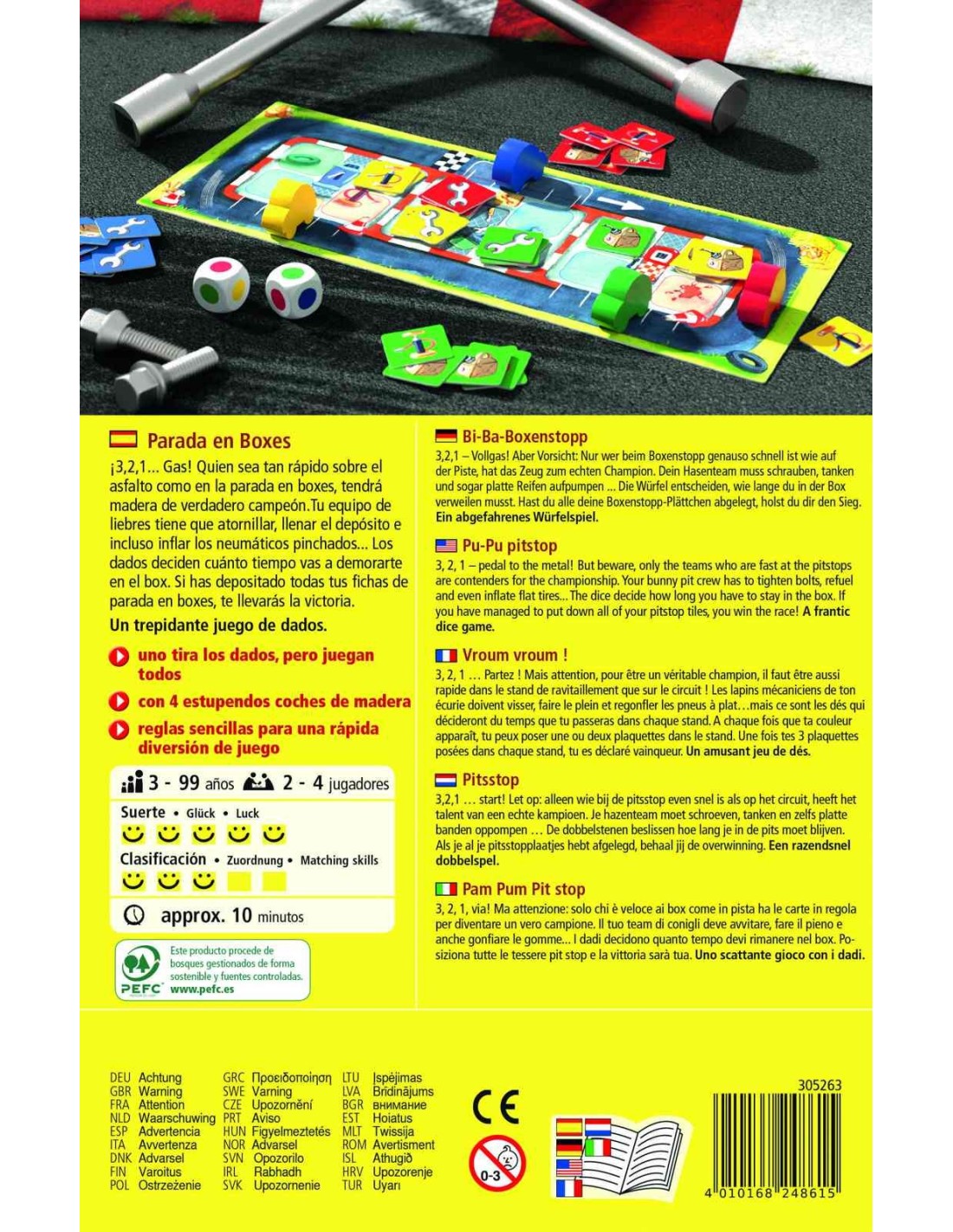 Comença la carrera! Qui sigui tan ràpid sonbre l'asfalt com en la parada a boxes, tindrà fusta de veritable campió. Durant la carrera, els jugadors i les jugadores han de passar pel box i dipositar allí les seves fitxes de parada a boxes. Els daus decideixen quant cal demorar-se cada vegada en el box. Gana la partida qui aconsegueixi haver passat amb èxit per totes les parades a boxes.
