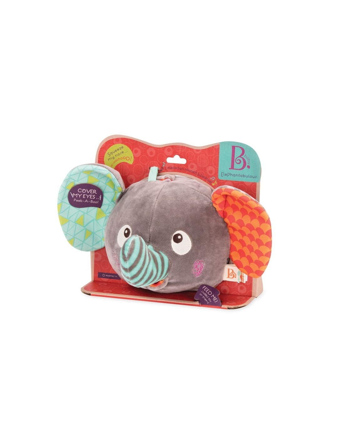 La marca de joguines B. You (B. Toys) presenta aquest preciós elefant de peluix. Pensat per a nens i nenes a partir de 0 anys, amaga en ell alguns secrets molt divertits. Per començar, les seves grans orelles tenen diferents colors per estimular el sentit de la vista. A més, pots jugar amb elles a tapar-li els ulls i fer veure que s'està amagant. Els encanta! En segon lloc, si li apretes el nas el petit elefant esternuda i, com és un golafre, si li poses els ditets a la boca començarà a fer sons com si mastegués. Anem ara a la seva esquena, si ho gires veuràs que té amagat un ocellet, toca-ho i escoltaràs com canta. Finalment, a l'botar farà sons "boing boing" Una joguina súper completa, ideal per regalar a nadons.