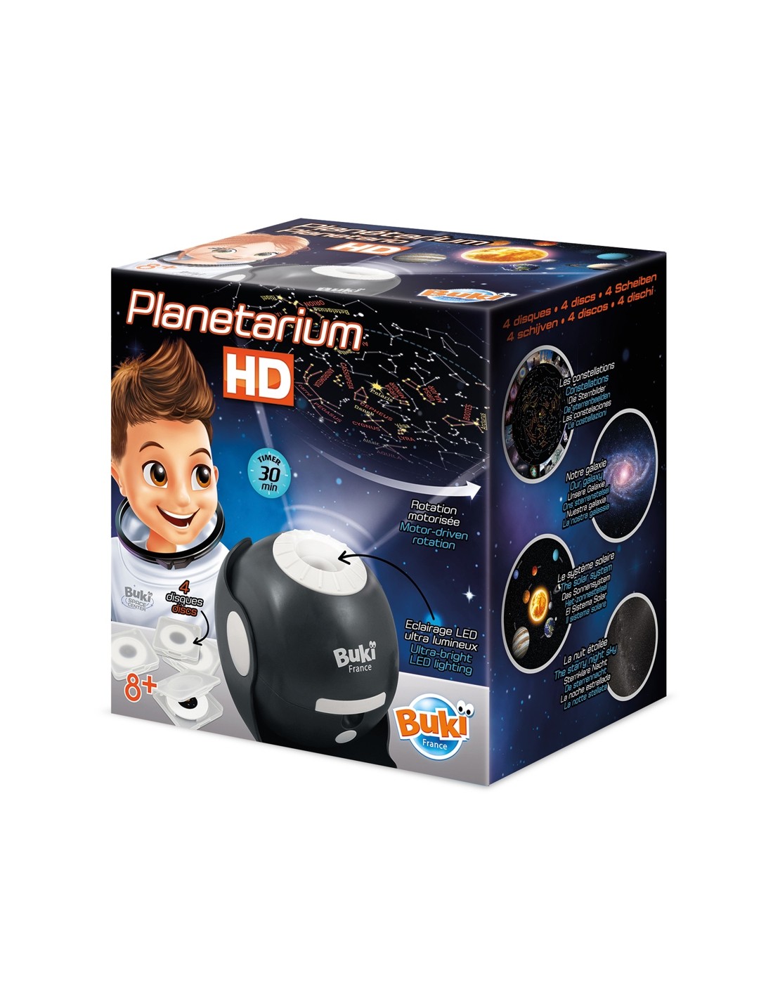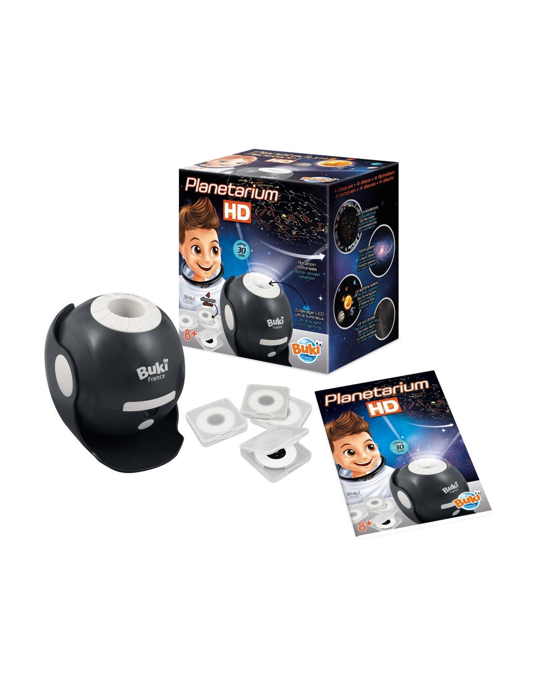 El joc inclou tres discos intercanviables que mostren la Via Làctia, les constel·lacions i el sistema solar. Gràcies al seu LED ultralluminós, les projeccions aconsegueixen entre 1,8 i 2,5 metres de longitud, oferint imatges d'alta definició. A més, la lent i l'angle del projector són ajustables, i compta amb un sistema de rotació motoritzat i un temporitzador de 30 minuts, ideal per a sessions d'exploració segures i controlades.
