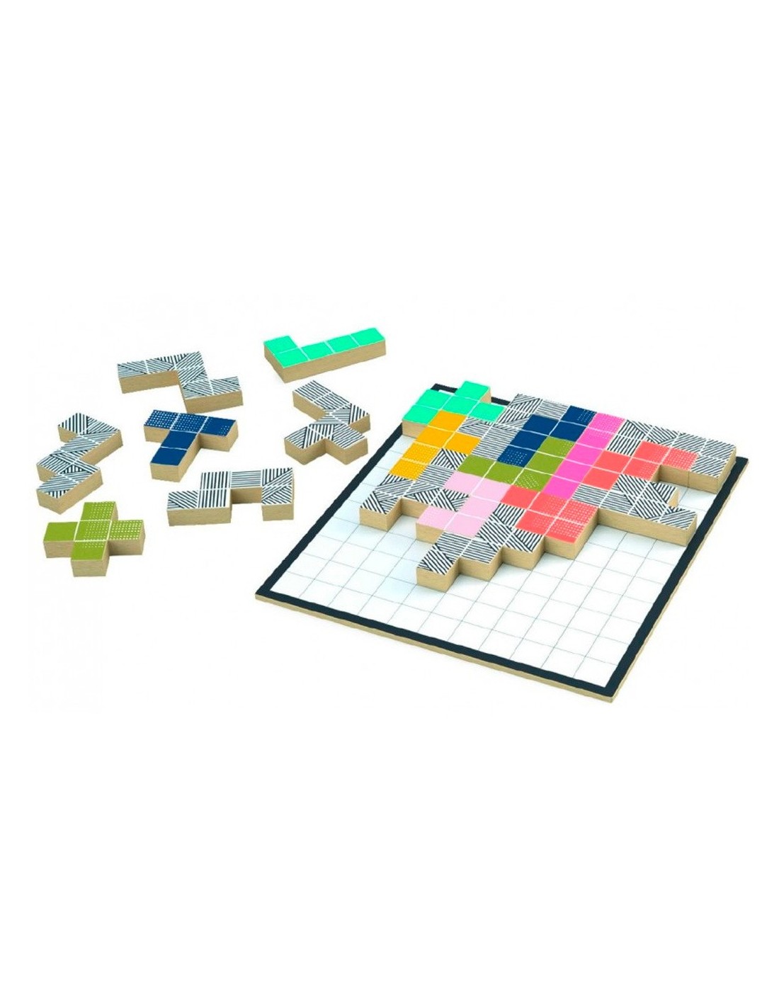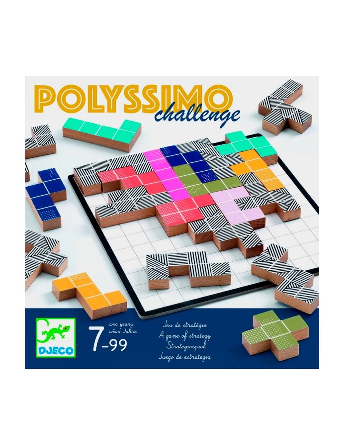 Joc d'estratègia i lògica per a 2 jugadors. La primera fase del joc té a veure amb l'elecció de les peces: cada jugador, al seu torn, selecciona una peça fins que no hi hagi més al centre de la taula. Després, cada jugador col·loca una de les seves peces en el tauler de joc. Quan els jugadors ja no poden col·locar les peces, comptem les peces restants. Qui tingui menys guanya el joc. Les peces en blanc i negre tenen formes més difícils de posar i poden equilibrar el joc si els jugadors són de diferents nivells. Cal ocupar el terreny al màxim deixant, si és possible, espais que l'oponent no podrà utilitzar. Un derivat del joc Polyssimo que requereix anticipació i bona visió espacial! Contingut: 1 tauler de joc (19 x 19 cm), 24 peces de fusta (12 peces de colors amb 5 quadrats, 12 peces de colors amb 6 quadrats), regla.