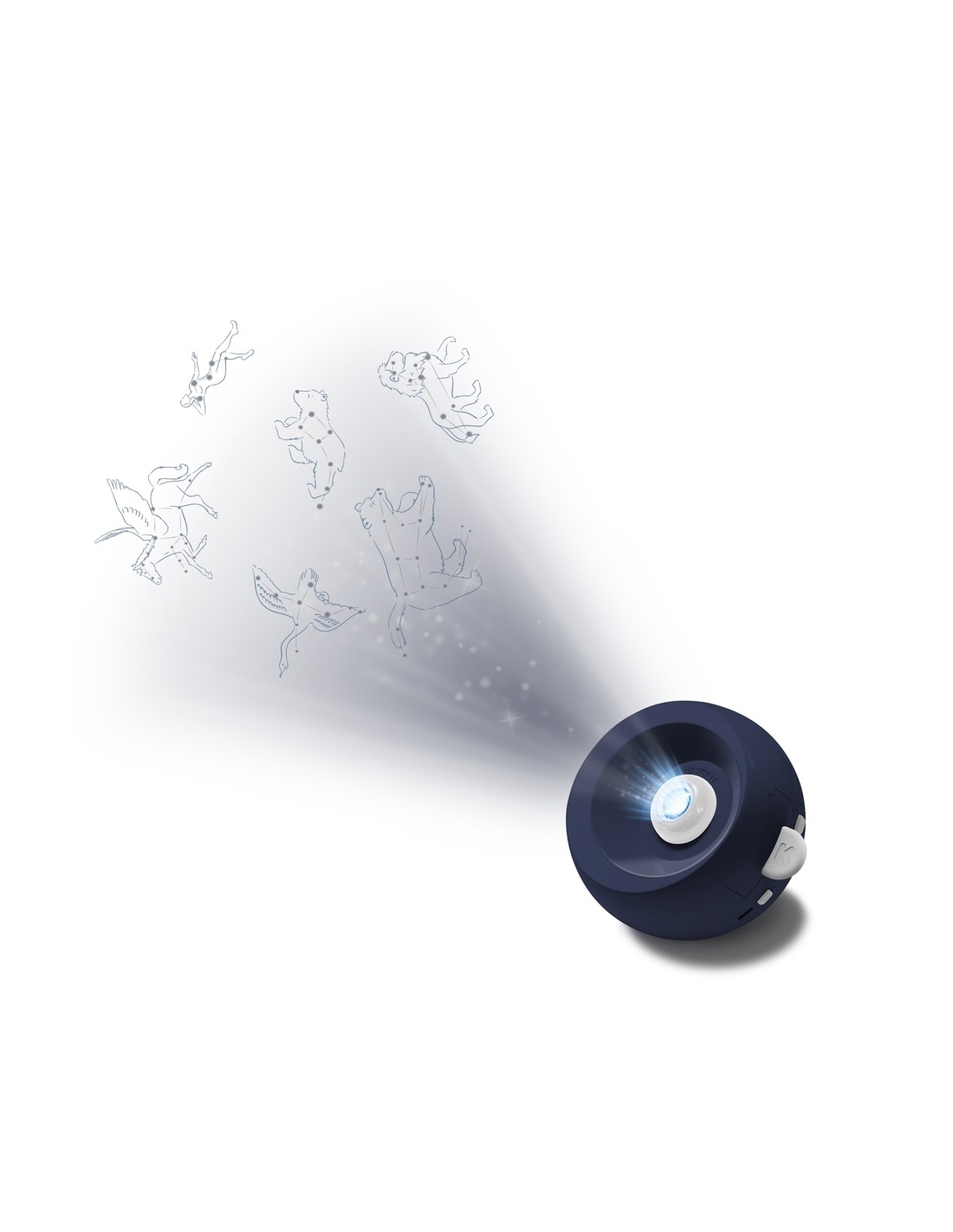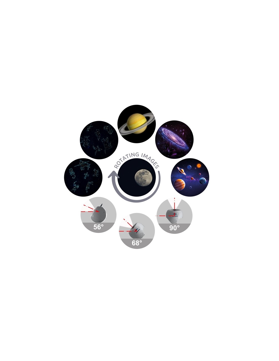Aquest projector compta amb un sistema de rotació que permet un gir complet de 360 graus en 8,30 minuts, proporcionant un espectacle continu i envolupant. A més, incorpora tres pistes de música integrades i connectivitat Bluetooth amb un altaveu de 5 W, per a combinar projecció d'imatges amb música ambiental, creant un efecte relaxant que ajuda a calmar els nens abans de dormir.