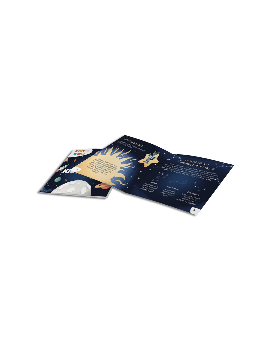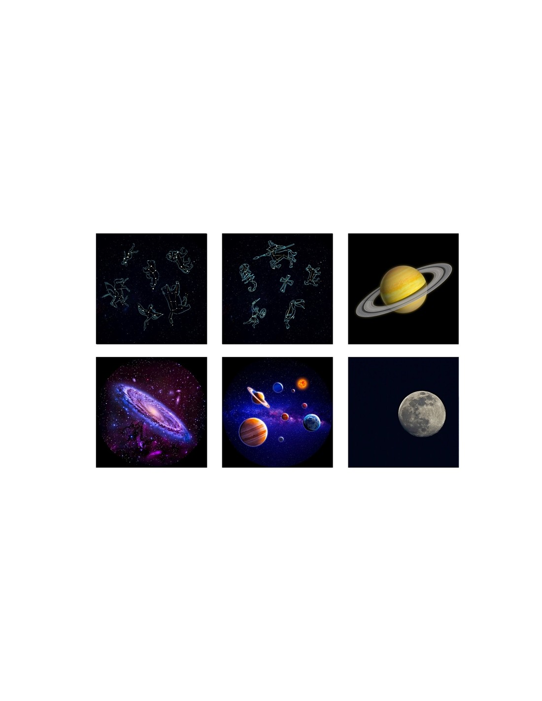 Gràcies als seus sis discos intercanviables amb temàtica de galàxies, el KidyStar ofereix un viatge educatiu per l'univers. Cada disc inclou il·lustracions que, juntament amb el petit llibre didàctic, fomenten la curiositat, l'aprenentatge i la imaginació. Els nens poden explorar conceptes bàsics d'astronomia i descobrir nous mons mentre gaudeixen d'un entorn relaxant i segur.