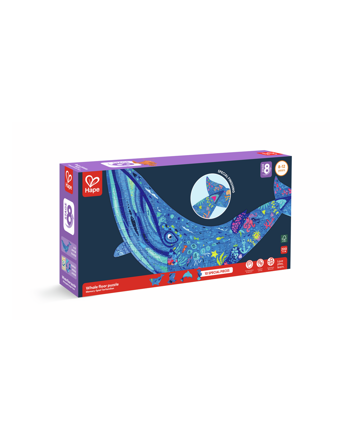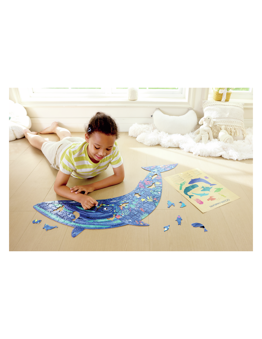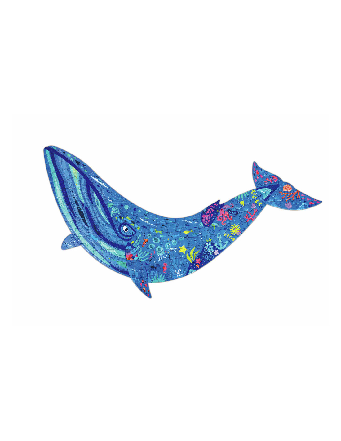Aquest puzle de terra presenta una impressionant balena de 200 peces que convida els petits a submergir-se en el món marí a través d'una activitat relaxant i alhora estimulant. La gran silueta, construïda amb peces de cartó gruixut i resistent, es converteix en una proposta perfecta per a descobrir detalls sobre un dels animals més grans del planeta mentre es gaudeix del muntatge.