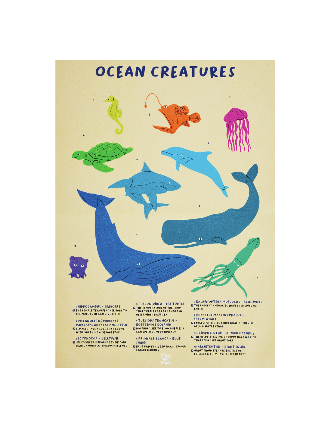 Inclou un pòster educatiu replet de dades curioses sobre animals marins, que permet complementar el joc amb una part més informativa. Els nens poden comparar el dibuix del pòster amb el puzle, identificar colors o textures i descobrir com viuen les criatures de l'oceà.
