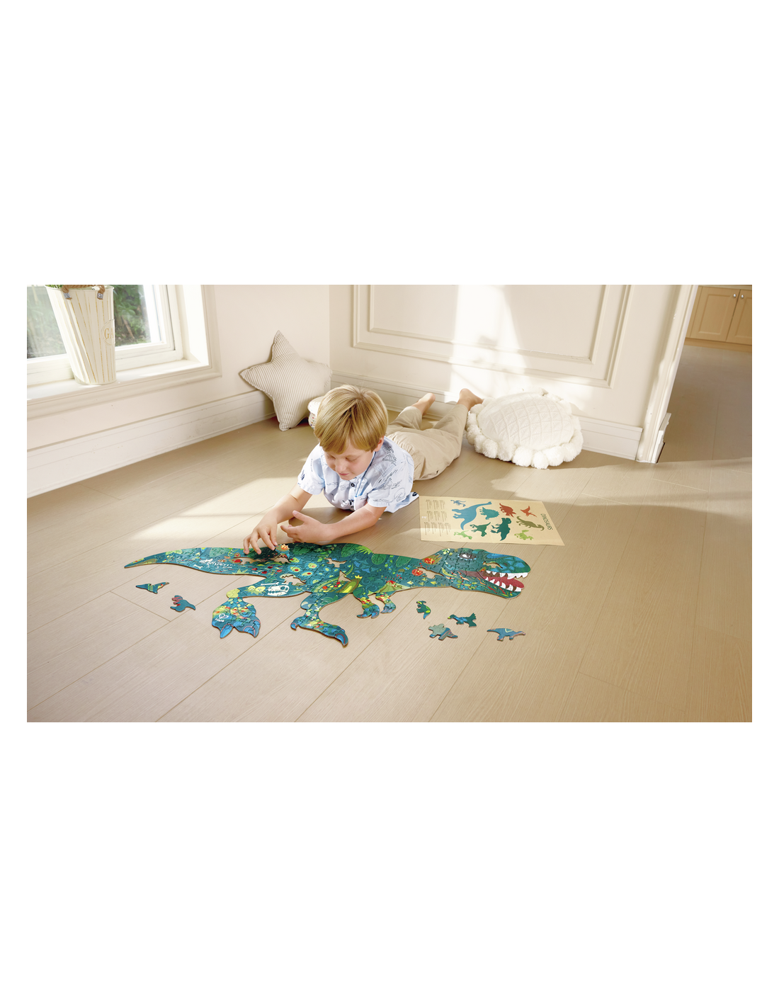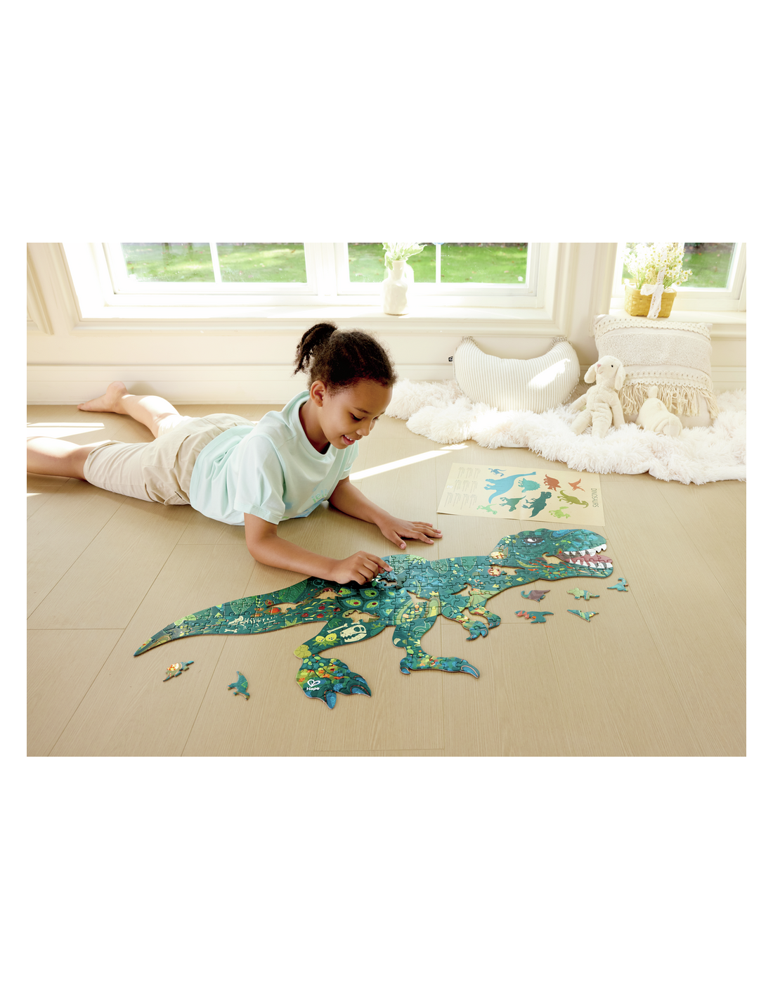 Aquest extraordinari puzle de terra de dinosaures convida els nens i nenes a descobrir el món prehistòric mentre gaudeixen d'un desafiament divertit i visualment impactant. Amb les seves 200 peces de gran grandària, forma una impressionant silueta de T-Rex repleta de detalls que capten l'atenció dels petits exploradors des del primer moment. L'acabat brillant afegeix un toc especial, aportant un efecte visual i tàctil que fa que cada peça resulti encara més atractiva.