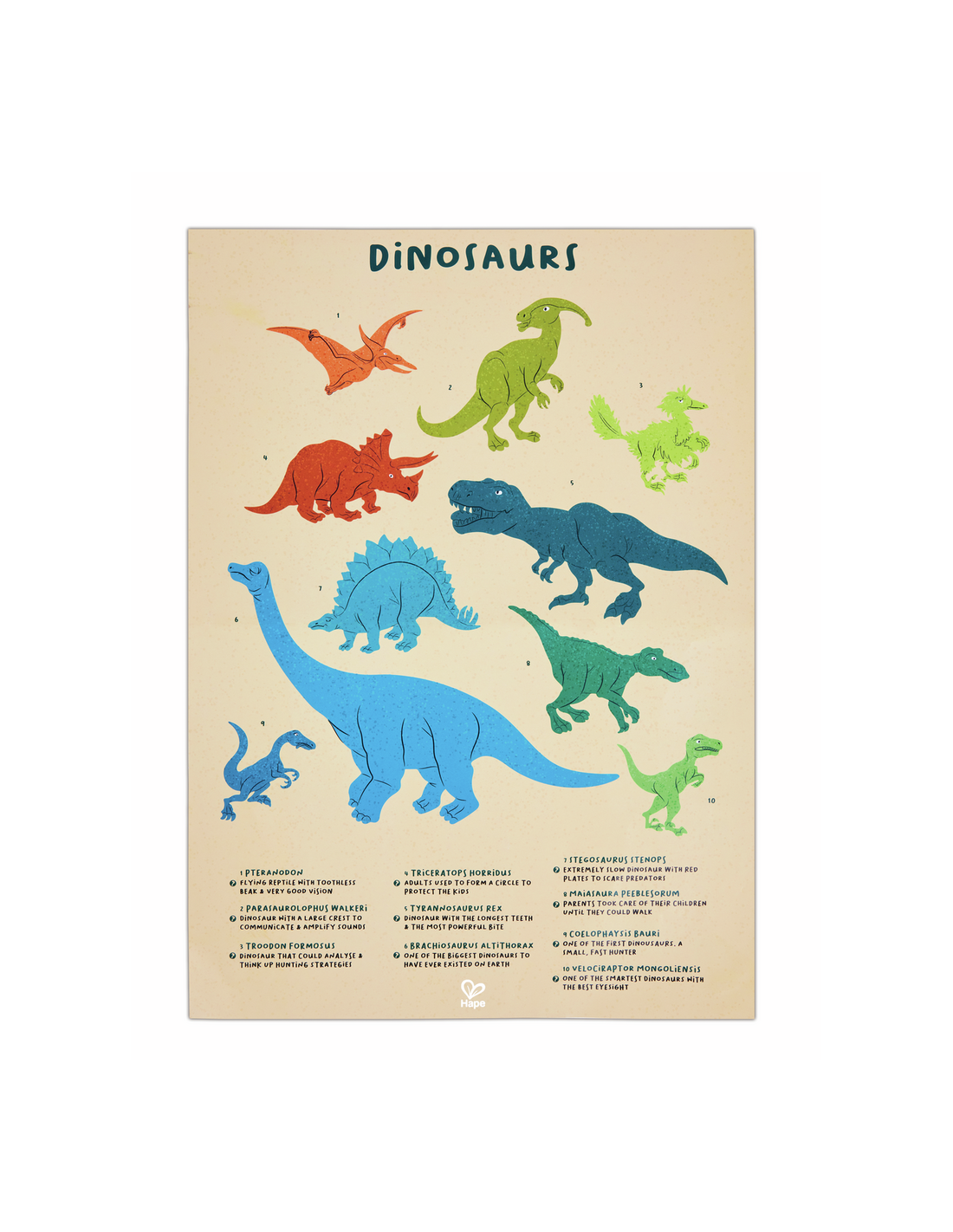 Inclou també un pòster educatiu ple de dades fascinants sobre diferents espècies de dinosaures. Aquest complement permet que el joc es converteixi en una experiència d'aprenentatge completa: mentre col·loquen les peces, els nens poden descobrir curiositats, identificar trets de cada espècie i despertar un interès genuí per la ciència i la història natural.