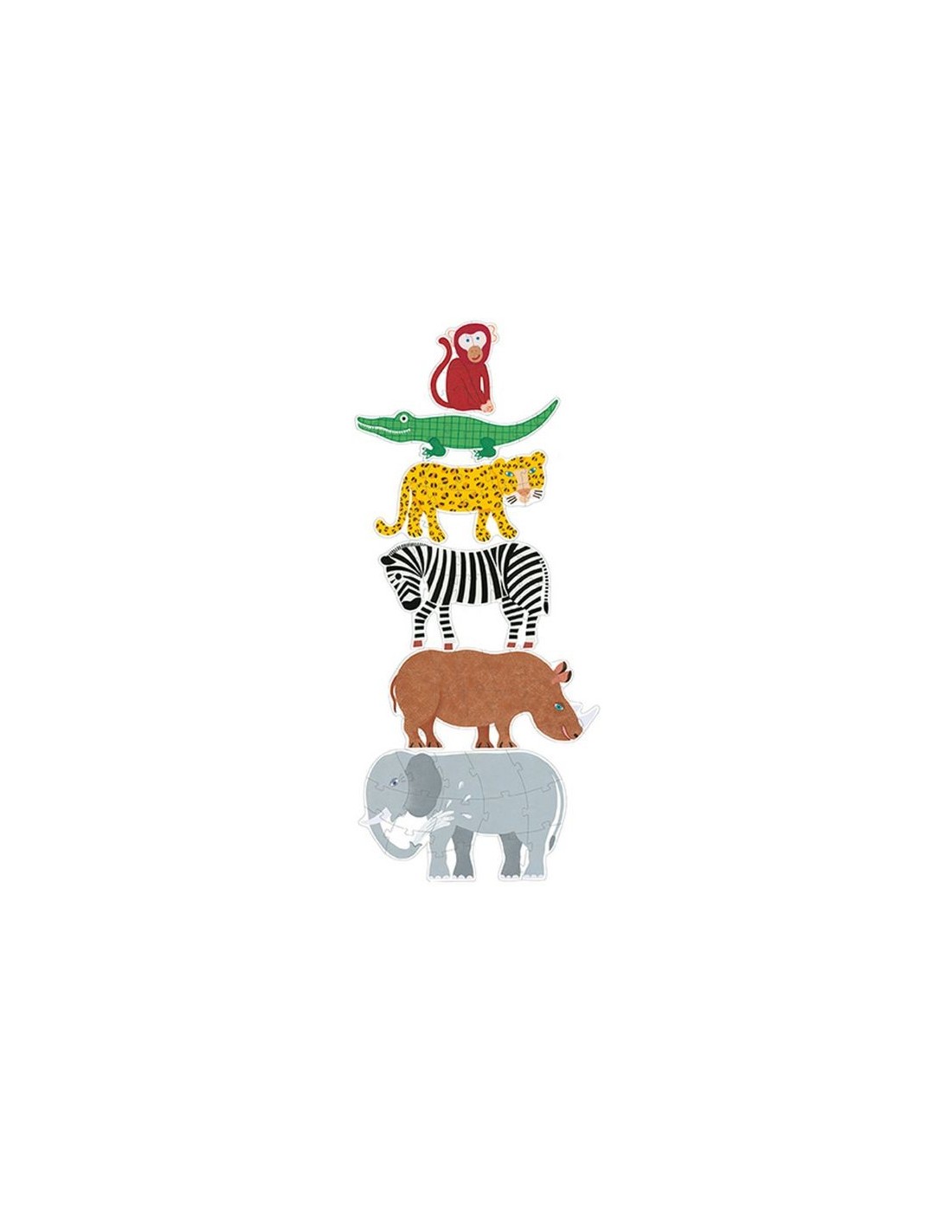 En total, tindreu sis trencaclosques d'animals dissenyats especialment per als més petits: elefant, rinoceront, zebra, pantera, cocodril i mico. Quin és el teu preferit? Tots aquests animals de la sabana són genials!