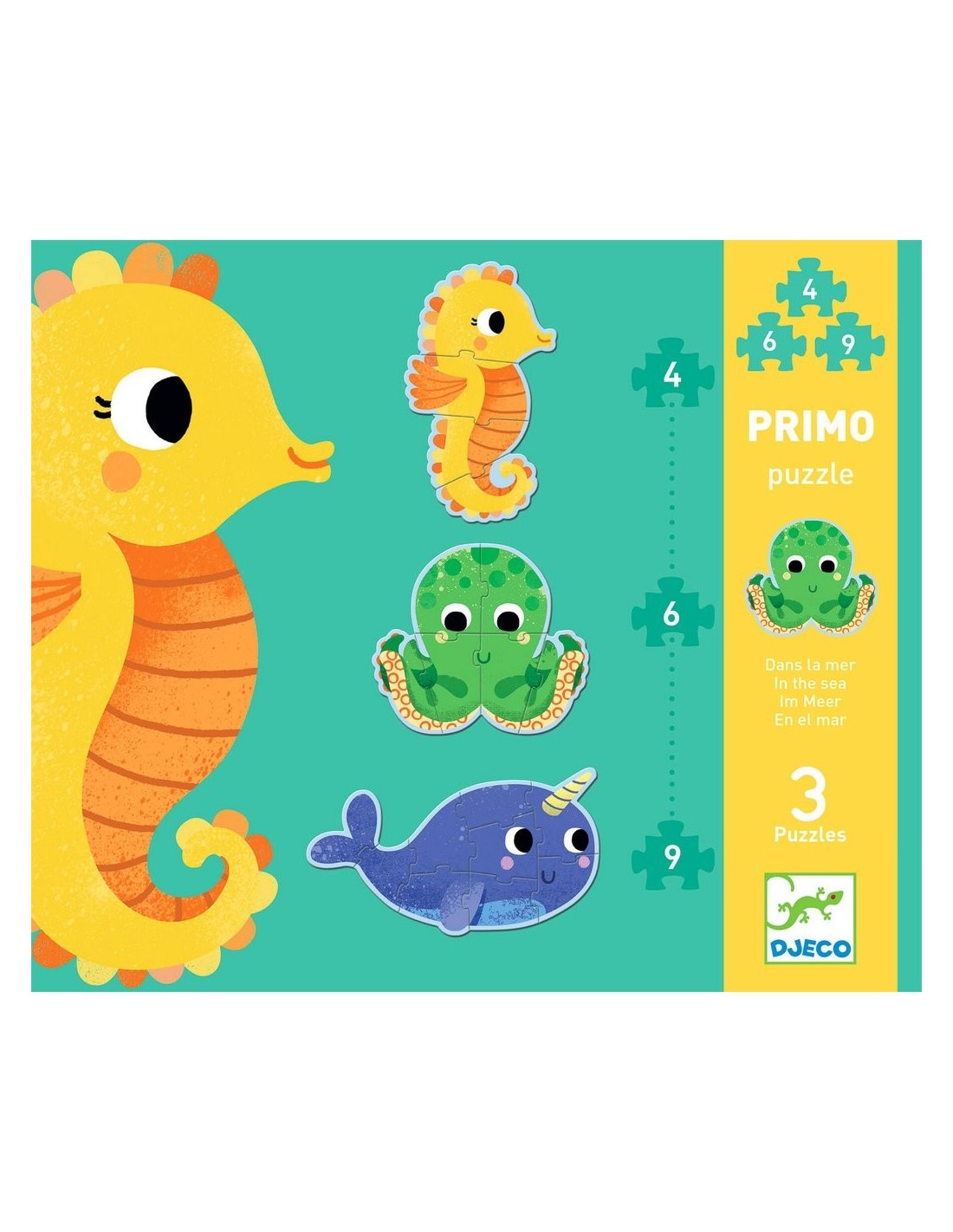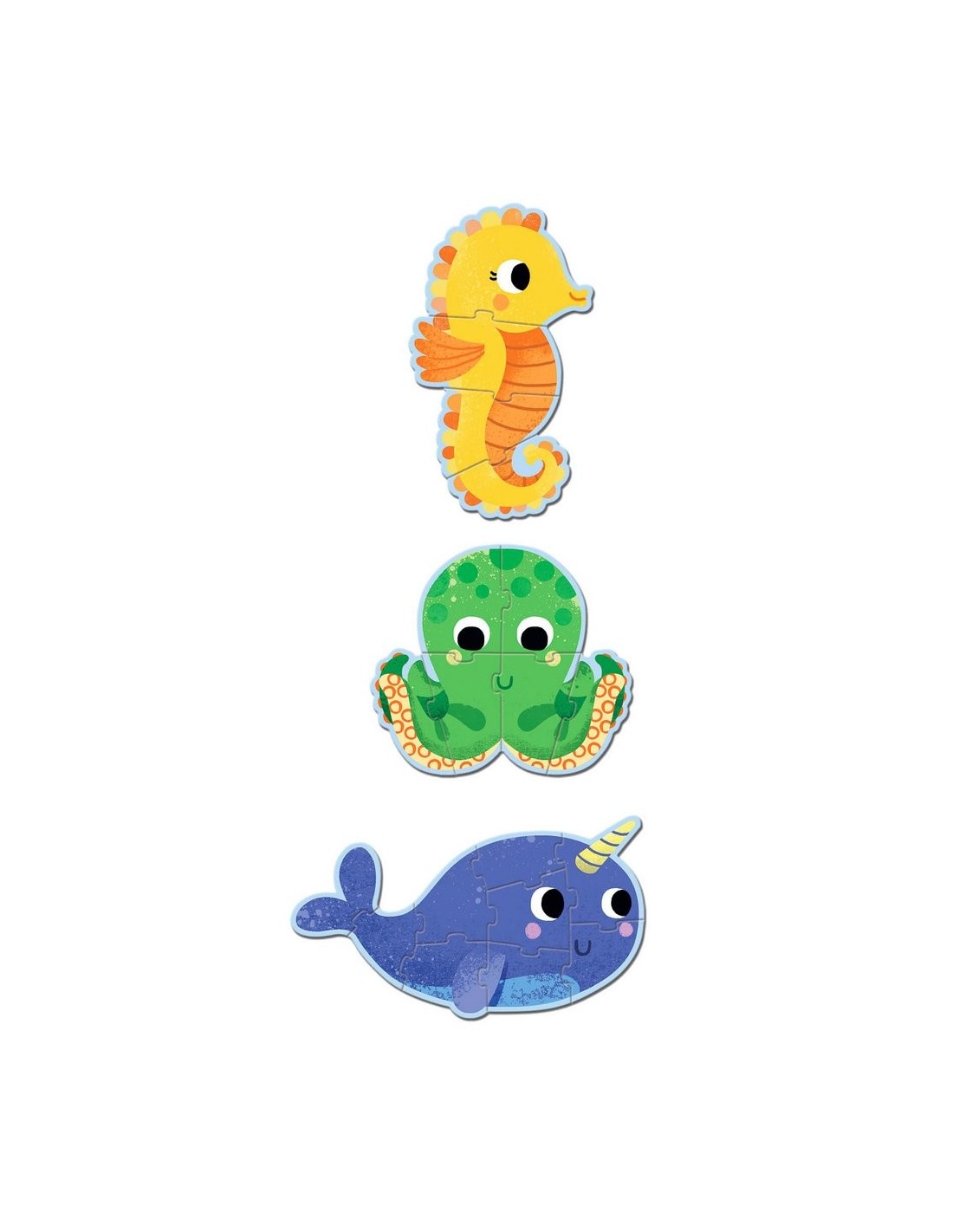 Us presentem aquest meravellós puzle de Djeco, ambientat en l'oceà. En la caixa trobaràs 3 trencaclosques de diferents dificultats: 4, 6 i 9 peces. Les encantadores imatges d'animals marins (un polp, un caballito de mar i un narval) aviat es convertiran en les favorites del teu fill. Aquest tipus de joc desenvolupa el pensament lògic, la destresa, les habilitats motores fines i el reconeixement dels colors.