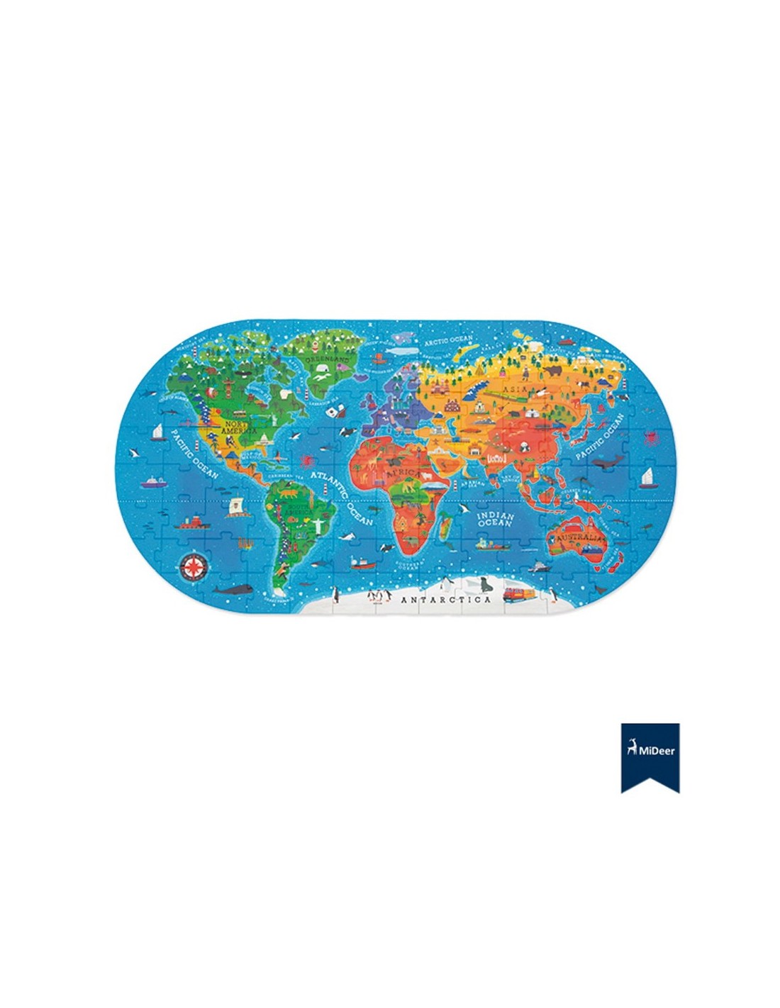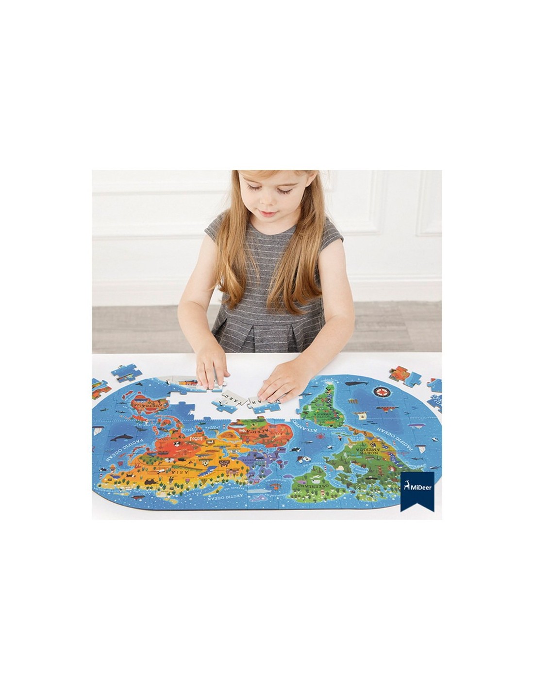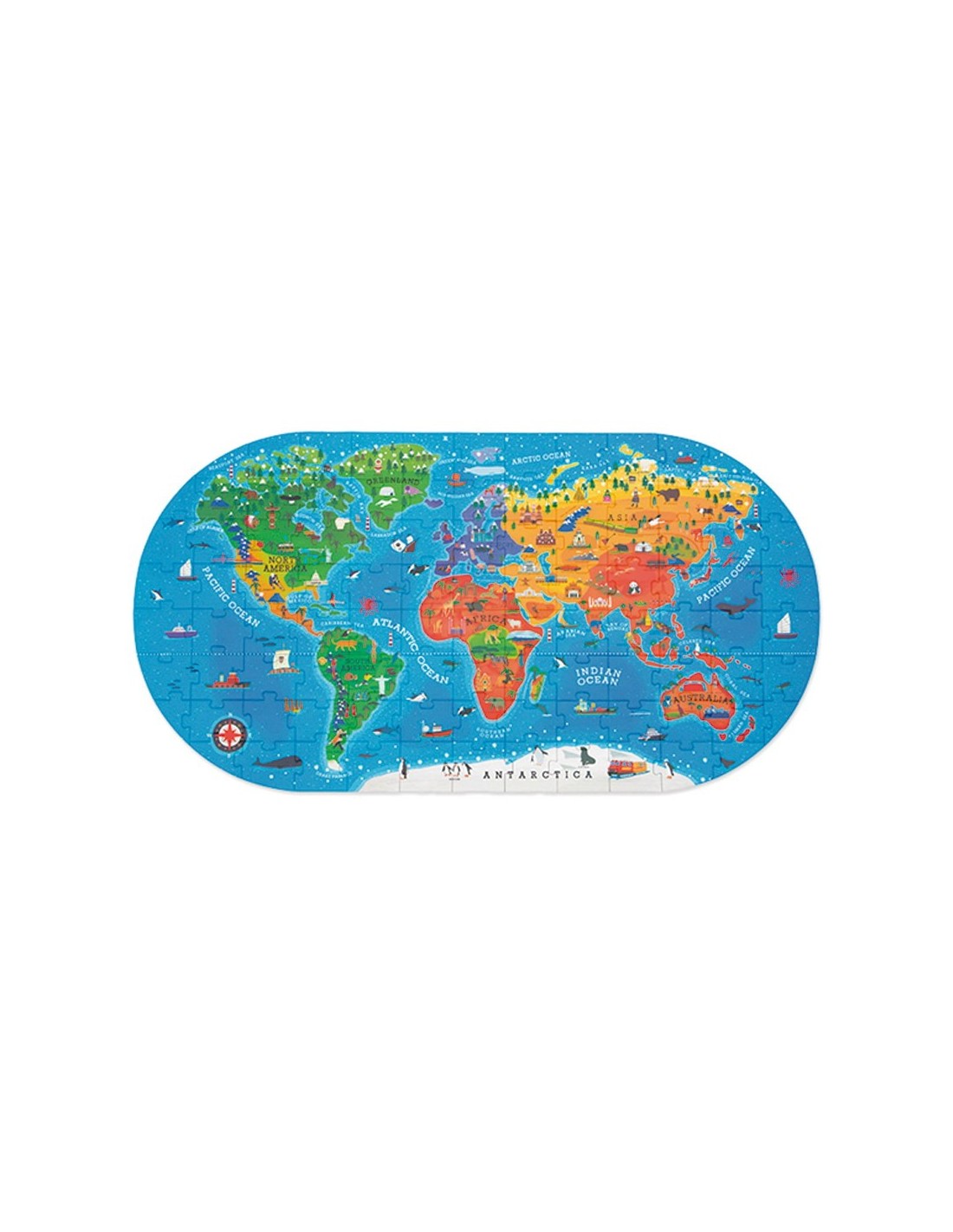 Puzle mapamundi de 100 peces que inclou una guia per facilitar el procés. Ideal per aprendre també geografia. Mides del puzle muntat 87cm x 46cm.