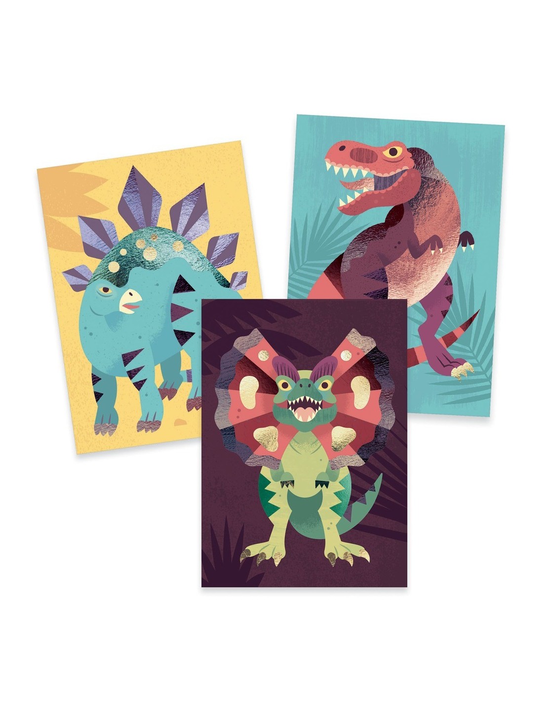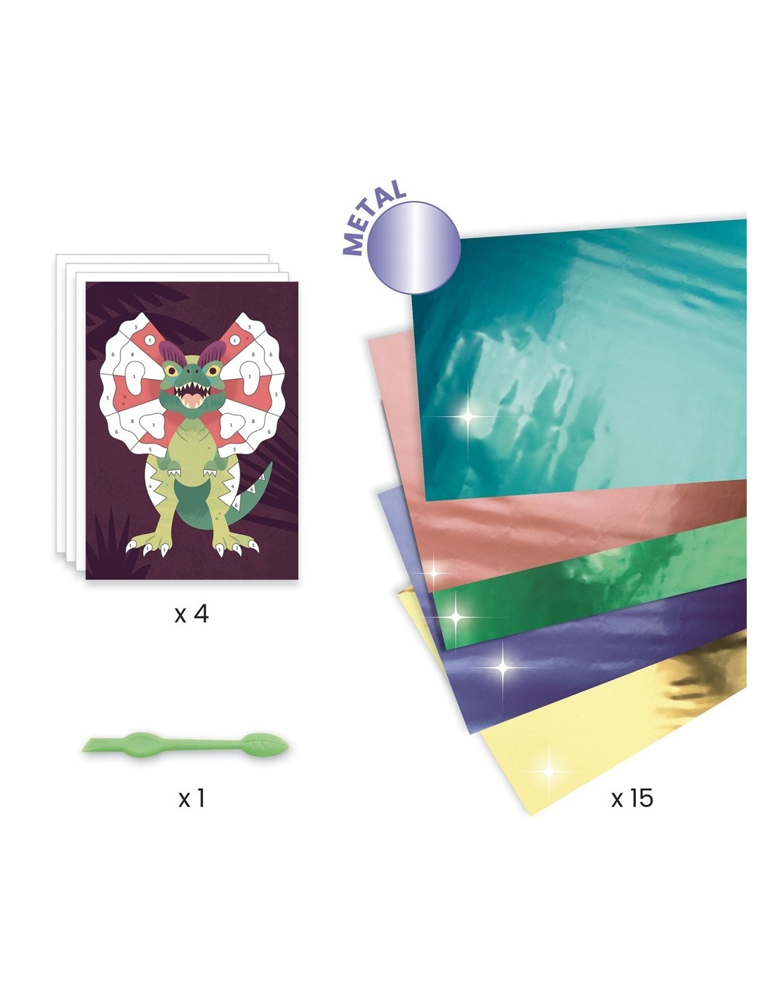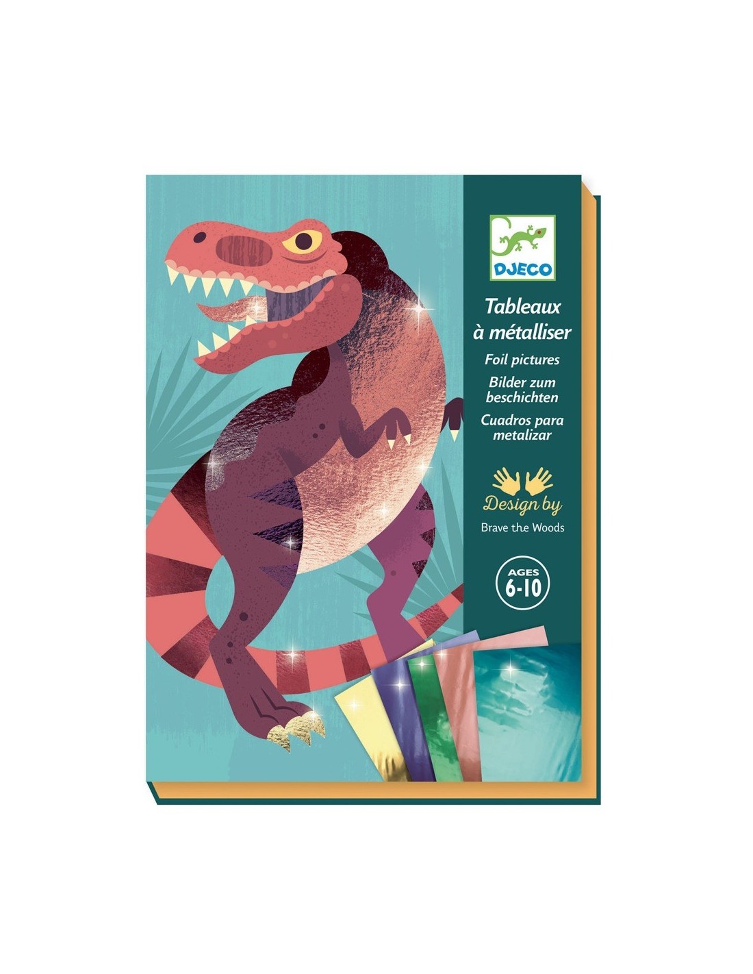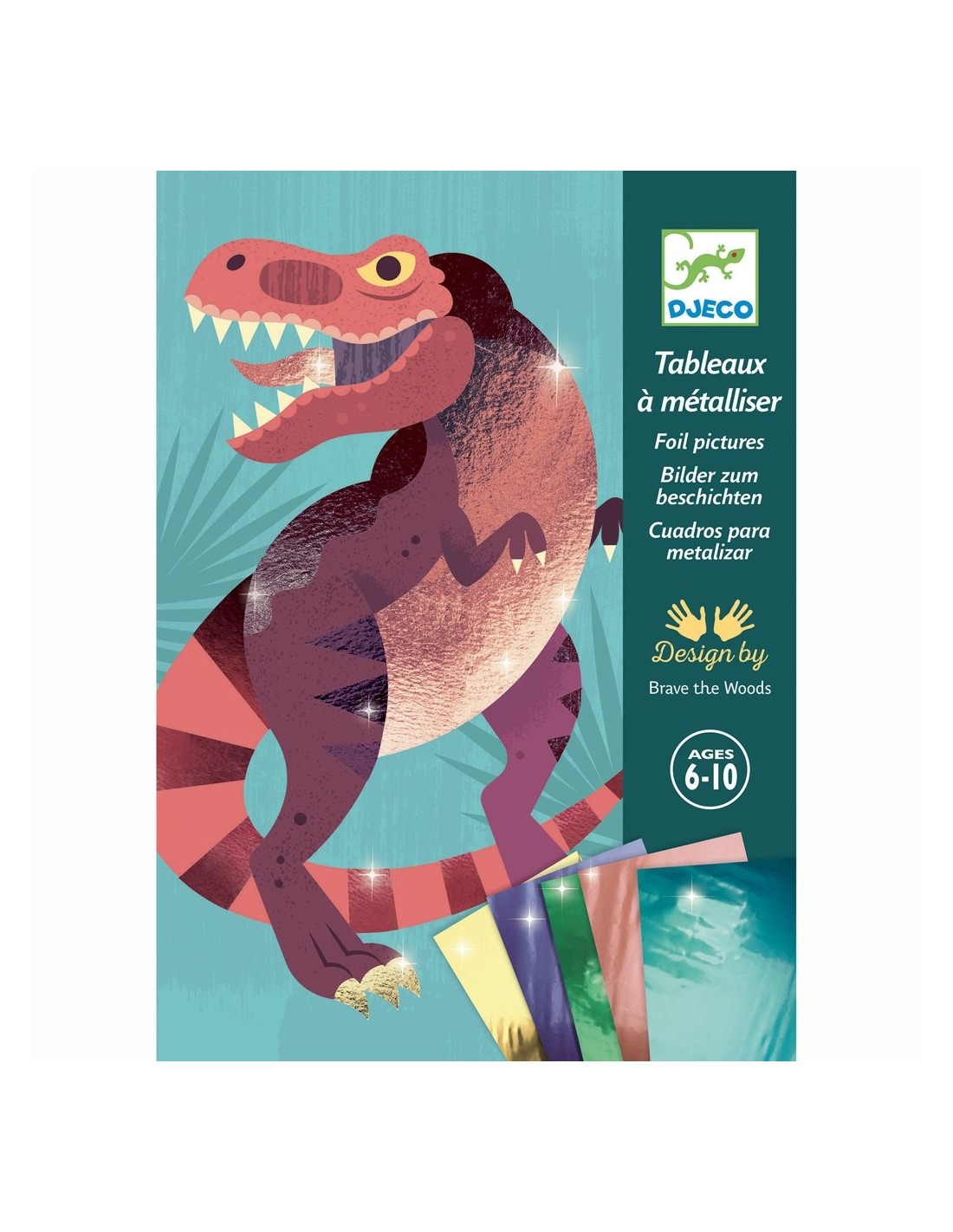 Descobreix quadres metal·litzats Jurassic de Djeco, una activitat creativa i divertida per a nens de 6 a 10 anys sobre el tema dels dinosaures amb la qual crearan 4 quadres per a decorar amb fulles metàl·liques. Gràcies al codi de colors indicat en les taules, el nen identifica les zones a metal·litzar. Amb l'eina, retira la pel·lícula que protegeix la superfície pegada i després diposita la fulla metal·litzada sobre ella. El material es diposita com per art de màgia i els quadres s'il·luminen.