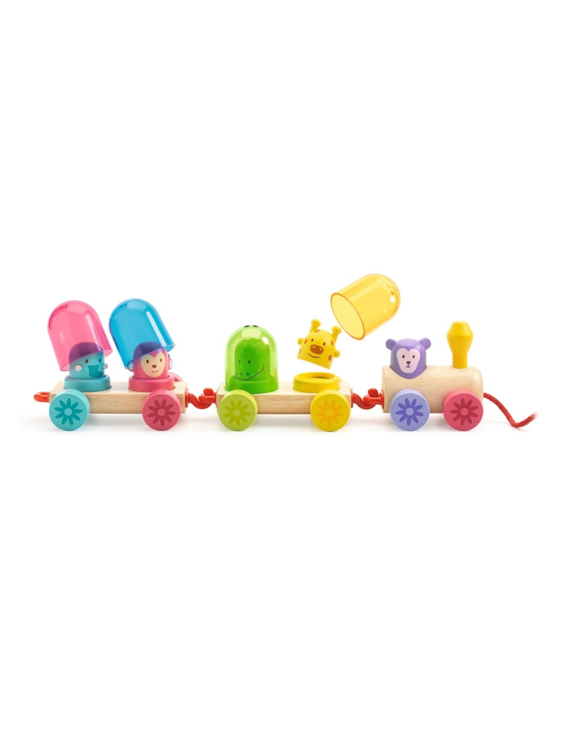 El Rainbow Train de Djeco compta amb 3 vagons extraïbles i un total de 13 peces repartides en 4 bases, 4 tapes i 5 personatges. Aquestes peces tenen els mateixos colors entre si, perquè els nens puguin aparellar-les i combinar-les, formant efectes de color i experimentant com els diferents colors combinen entre si. Posa una base groga sobre la girafa. Com li queda?