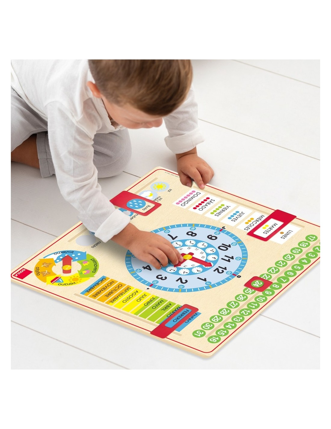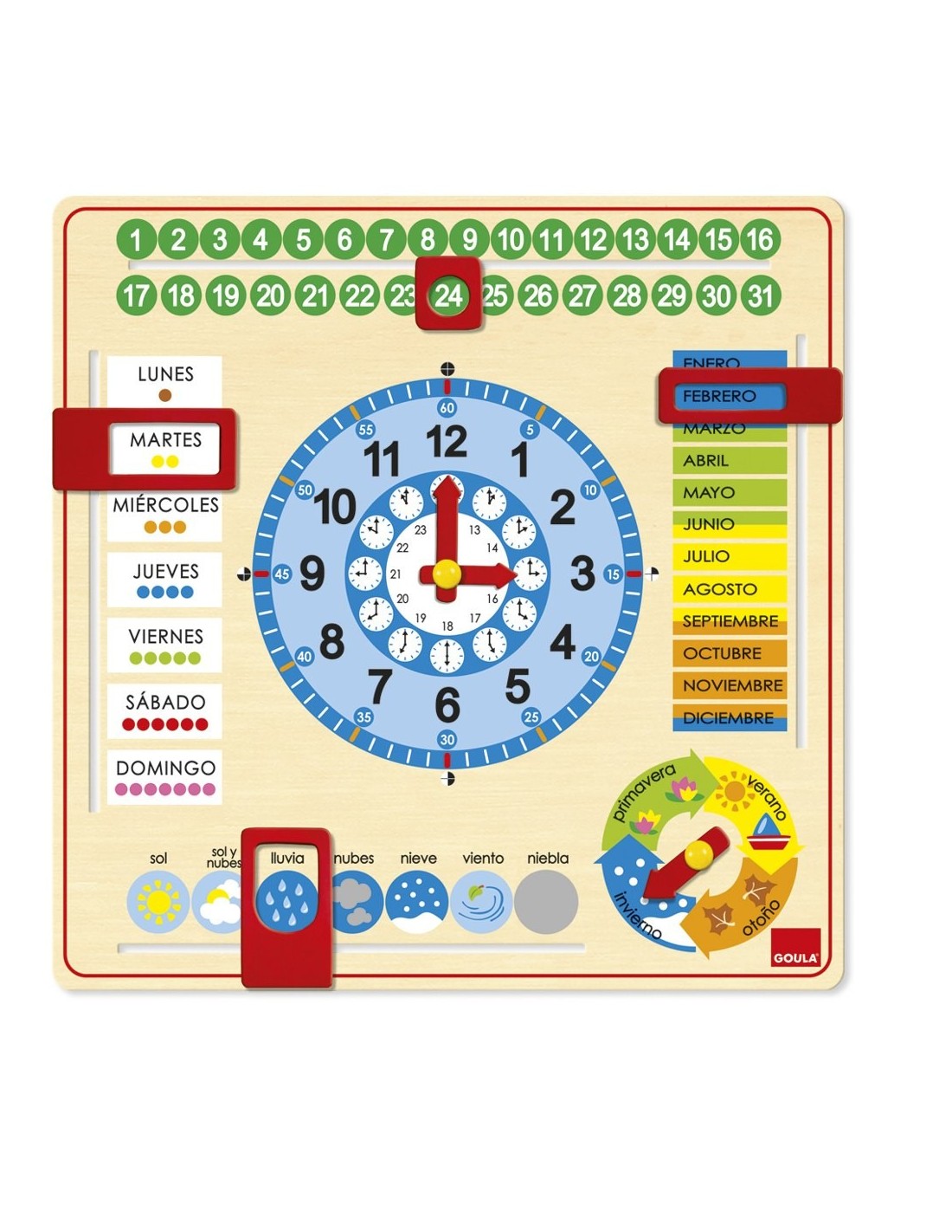 De la mà de la marca Goula et portem aquest fantàstic Rellotge Calendari, amb un innovador i original format que permetrà als nens aprendre les hores, els mesos i estacions de l'any de forma entretinguda i visualment atractiva. Aquest Rellotge Calendari de Goula està en llengua castellana i ve acompanyat amb uns marcadors per a assenyalar el dia i el temps, agulles manejables per a l'hora i el mes i les estacions de l'any en el calendari. A més, es pot penjar, per la qual cosa és ideal per a l'aula o l'habitació dels nens, i anar mirant-lo i actualitzant-lo cada dia, practicant l'aprenentatge dels diferents conceptes de temps inclosos.