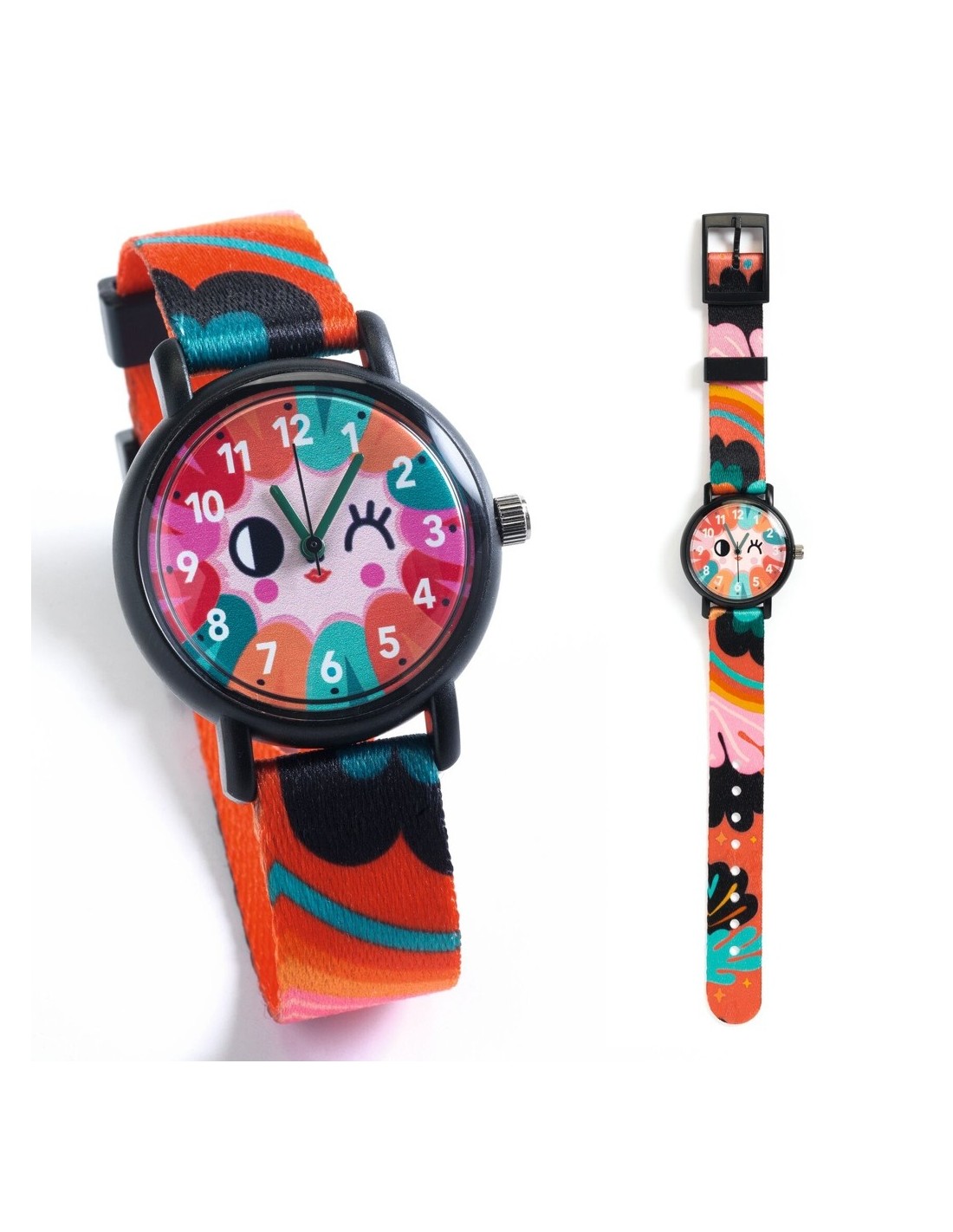 De la mà de la marca francesa Djeco et portem aquest rellotge infantil pop, un elegant rellotge de polsera de quars per a nens i nenes amb una bonica il·lustració pop per a aprendre a saber l'hora.