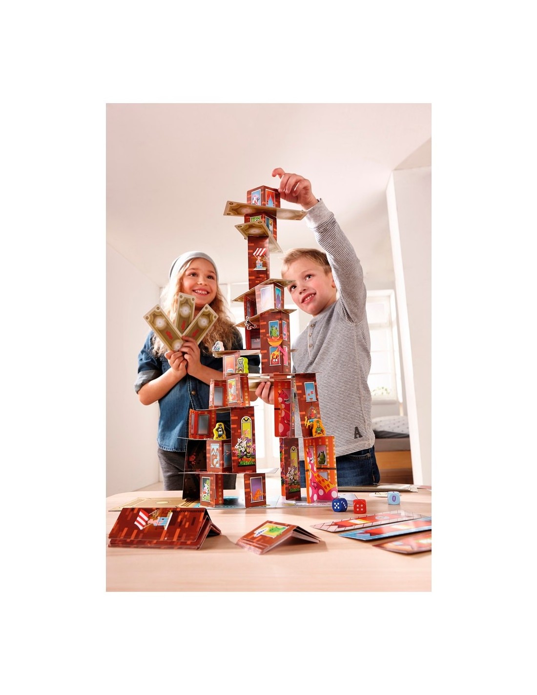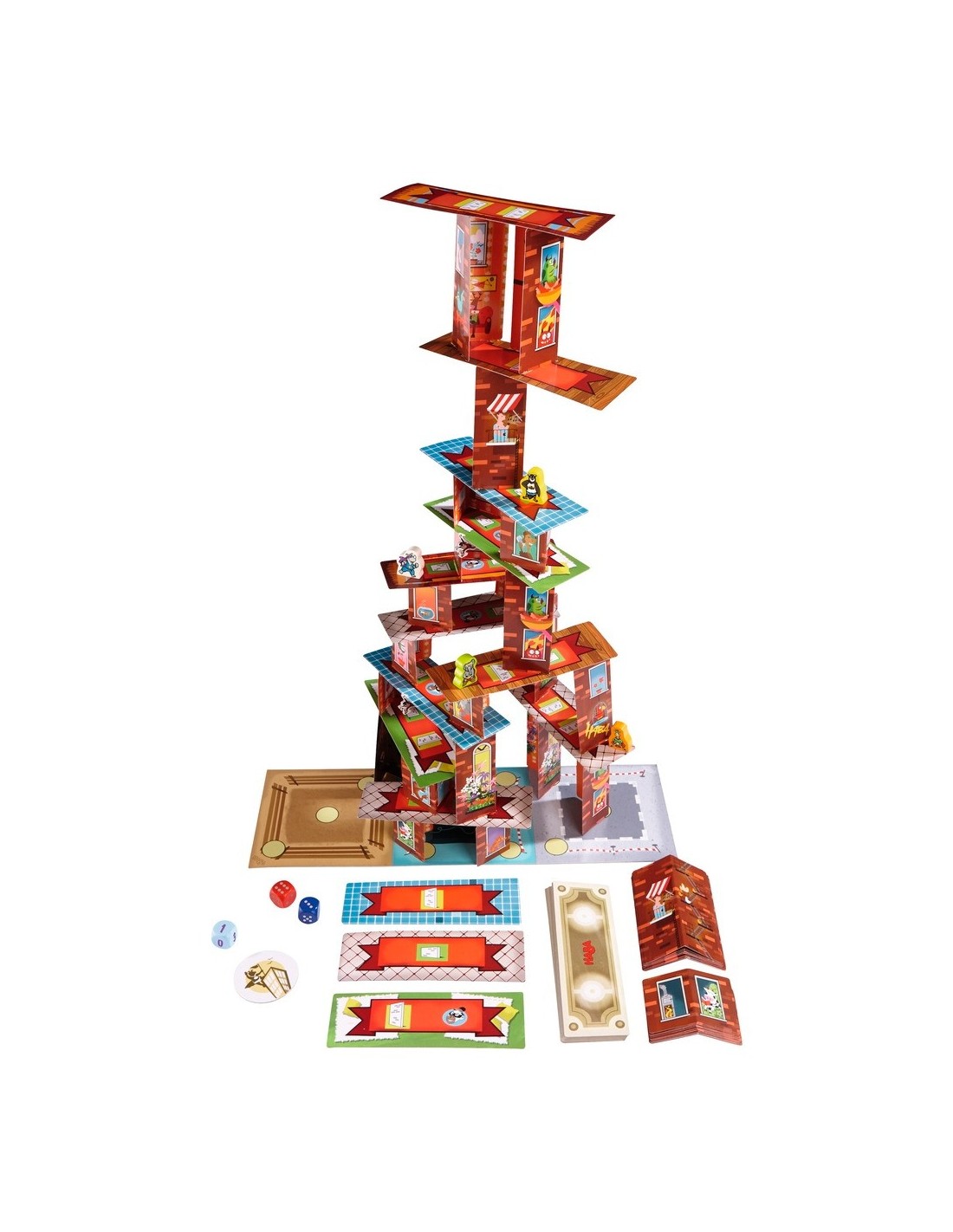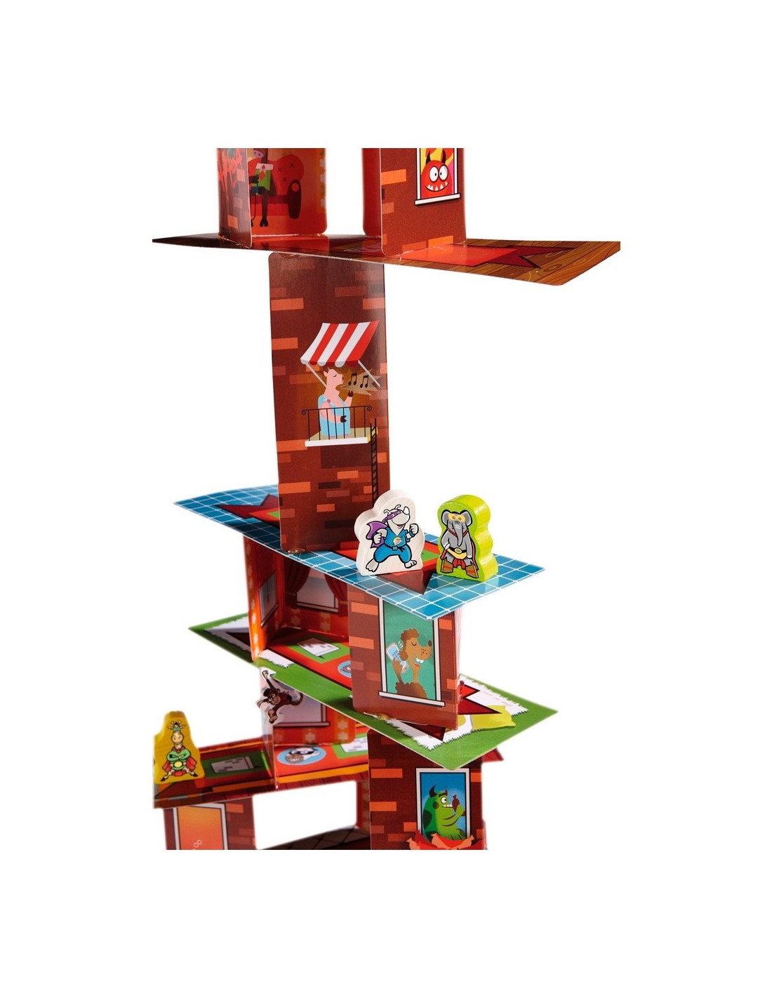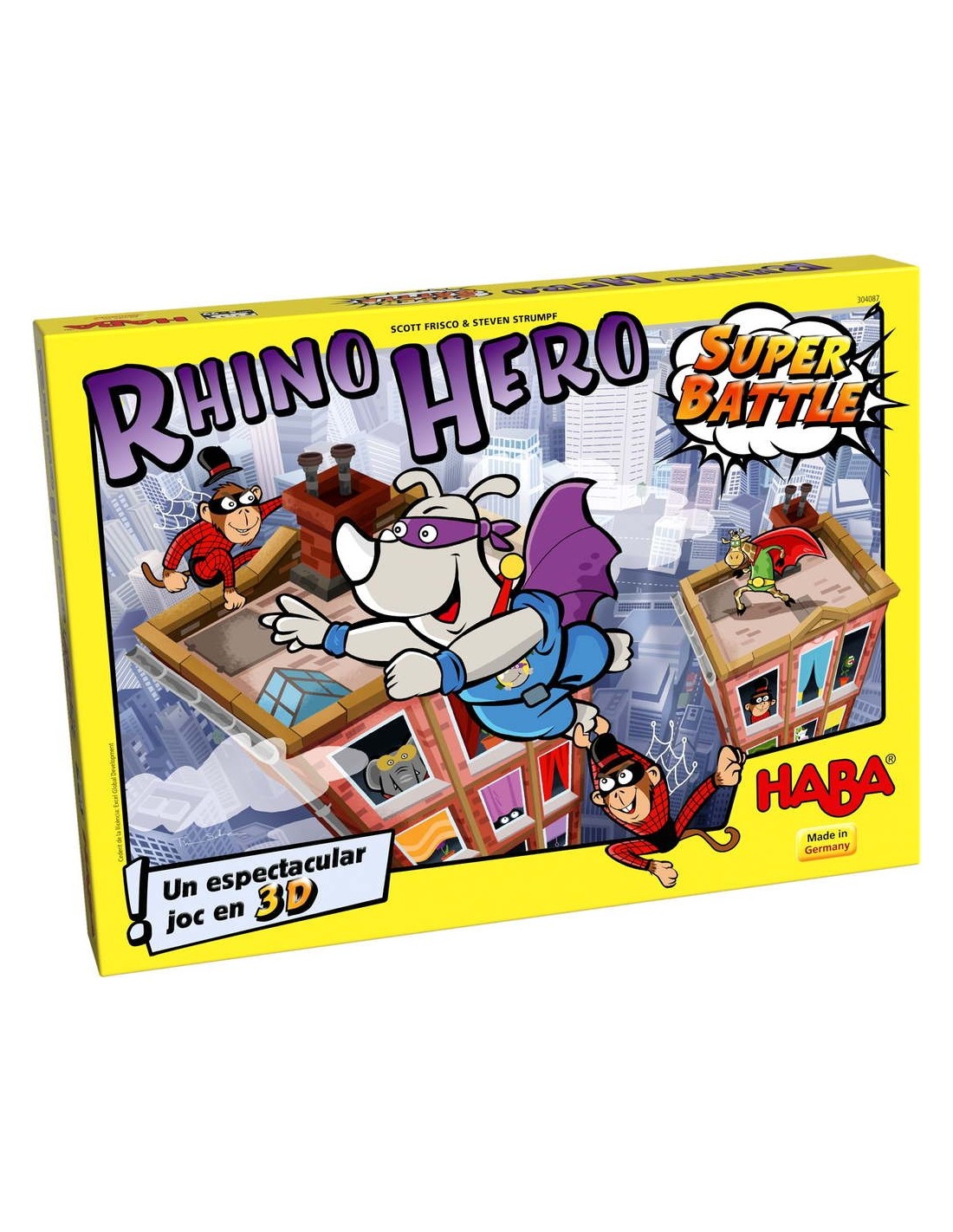 Rhino Hero torna a l'acció! En aquesta edició especial en català, a més d'escalar els gratacels que trontollen, disputareu dures batalles entre els quatre Superherois. Hauràs de ser hàbil i anar amb compte amb els micos-aranya perquè sempre intenten fer-te més difícil l'escalada a la victòria. Habilitats, diversió i tensió en aquest joc on hem de construir un espectacular Gratacels en 3D. Contingut: 1 tauler (3 quadrats de doble cara), 30 terres, 24 parets baixes, 24 parets altes, 3 daus (vermell, blau i blau clar), 4 micos-aranya, 4 superherois (Rhino-Hero, Girafa Boy, Big E. i Batgüin), 1 medalla de superheroi, 1 més indicacions del joc.
