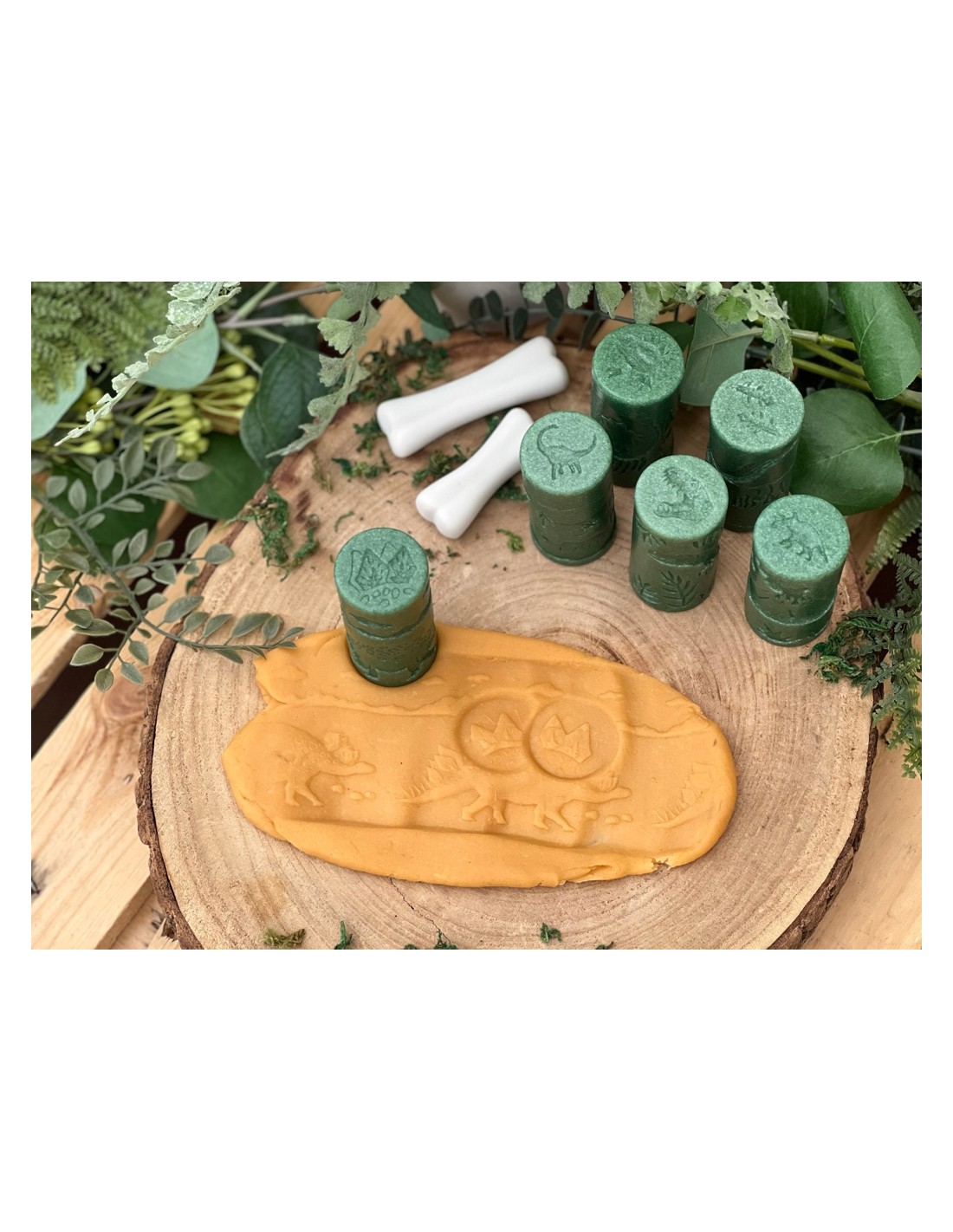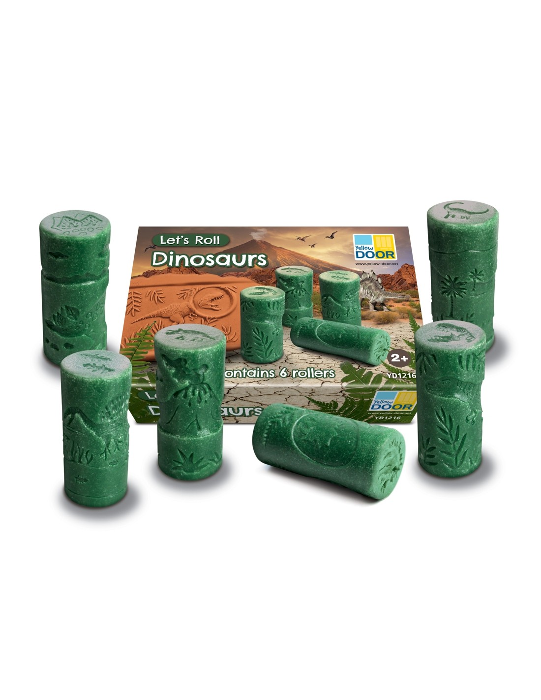 Aquest set inclou sis rodets amb diferents dissenys que representen a Tyrannosaurus rex, Spinosaurus, Diplodocus, Triceratops, Stegosaurus i ous de dinosaure, a més de textures inspirades en paisatges volcànics i fòssils marins. Els nens podran comptar les plaques del Stegosaurus, explorar la forma d'un crani rugidor o descobrir quin dinosaure neix dels ous en estampar la imatge.