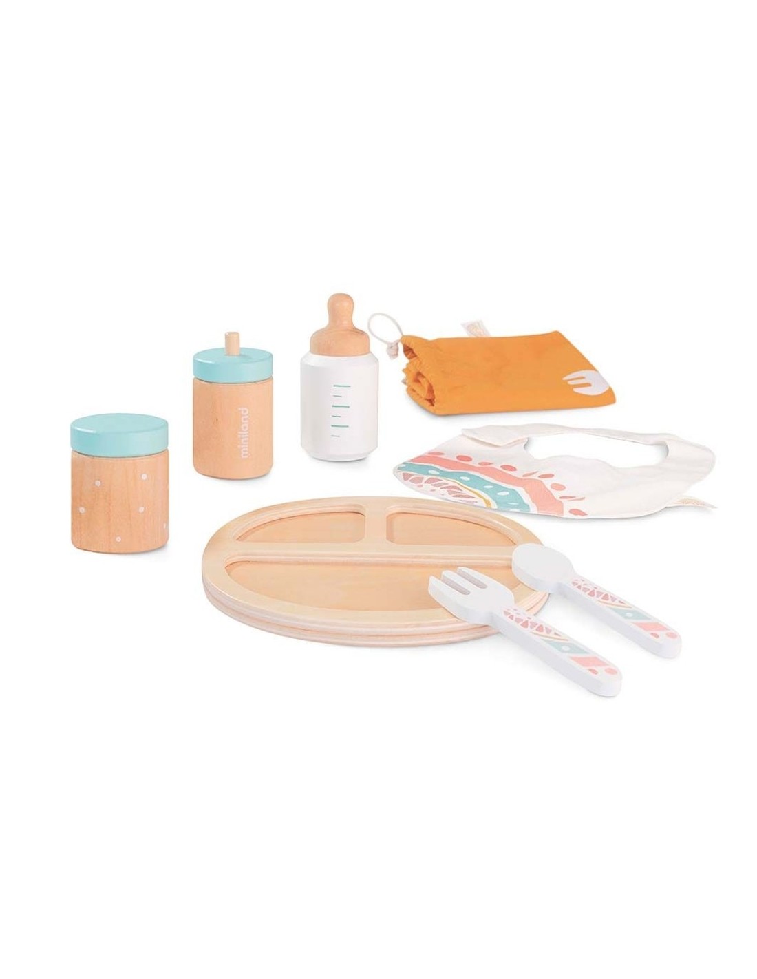 La marca Miniland ens porta aquest adorable set d'alimentació de fusta per a nines, un conjunt de fusta que conté tots els bàsics per a poder donar-li menjar a la teva nina o ninot favorit: ampolla, biberó, plat amb compartiments separats, cullera i forquilla, pitet i unes estovalles per a tenir-lo tot poliment i ben decorat. És genial!