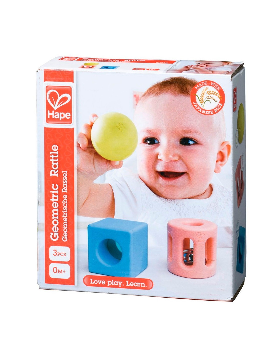 El sonall geomètric de colors tènues ha estat professionalment dissenyat per adaptar-se a la perfecció a les manetes, ajudant així a desenvolupar les habilitats de coordinació visomotora dels més petits a l'sacsejar i jugar amb ell. Fabricat amb materials ecològics a base d'arròs.