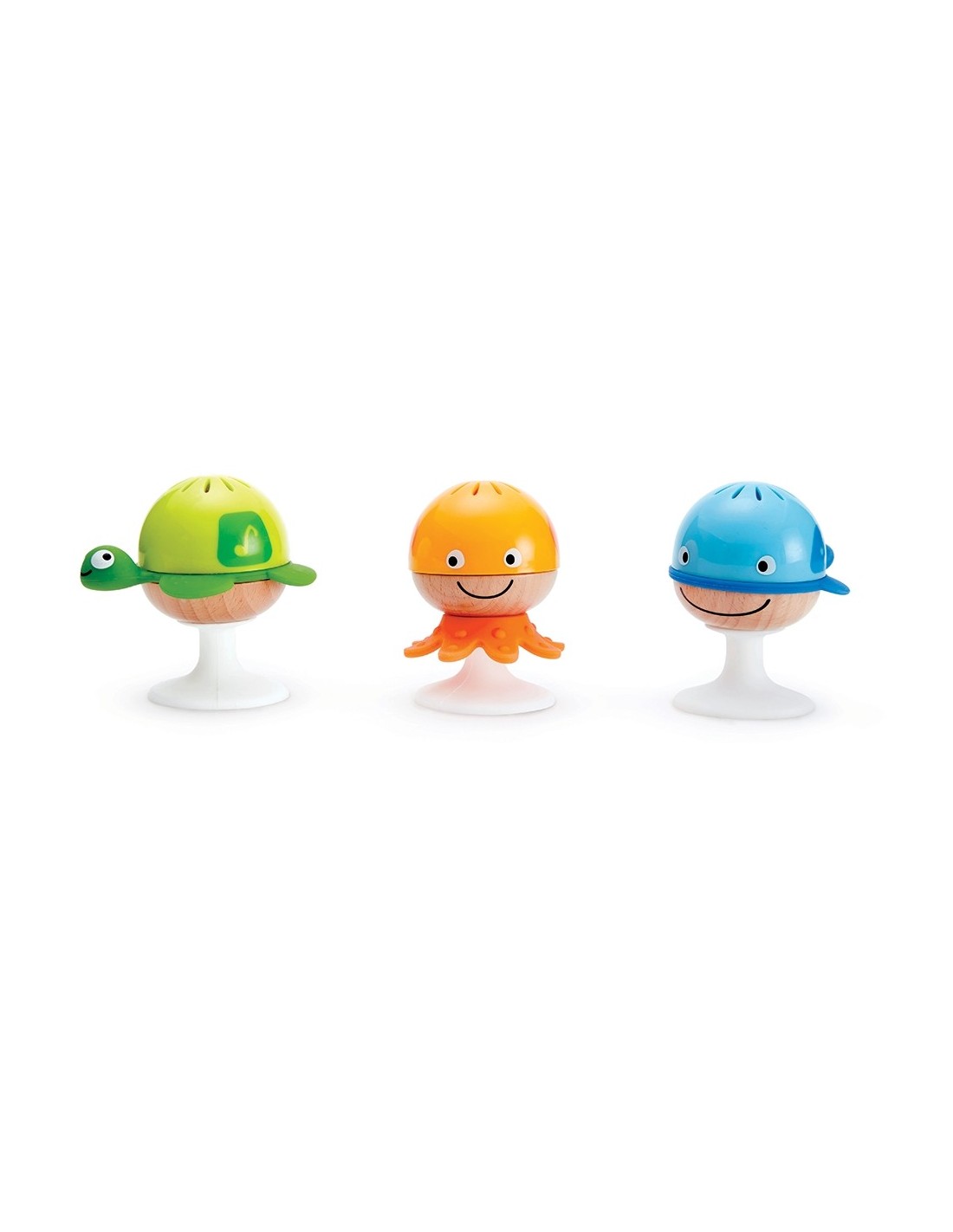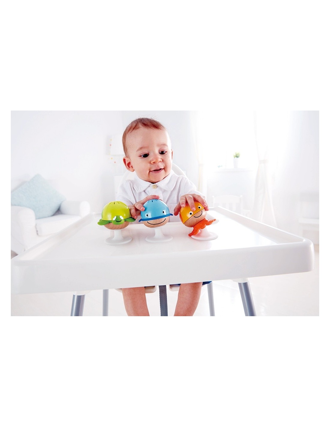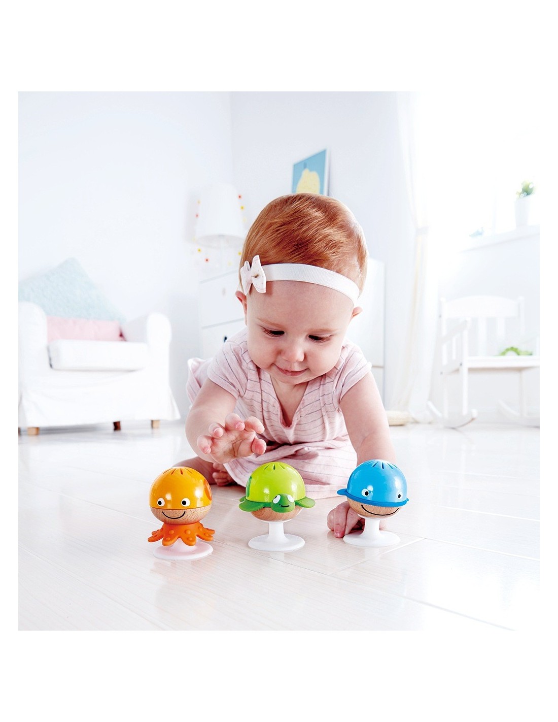 Pensats per a nens i nenes a partir de 0 anys, aquests bonics sonalls estan fabricats en fusta i tenen forma d'animalets aquàtics. Els seus colors brillants criden l'atenció dels més petits així com els sons que emeten quan els intentes moure. Cada un d'ells ve amb una ventosa incorporada pensada perquè la subjectis a la trona o en qualsevol altra superfície de joc. Això pot ser molt útil per evitar, per exemple, que caiguin a terra. La caixa inclou els tres models: balena, tortuga i pop i cada un d'ells fa un so diferent (pluja, cascavell i boletes) que els permetrà experimentar amb diferents combinacions de sons. Sens dubte una gran opció si estàs pensant en un regal per a primeres edats.