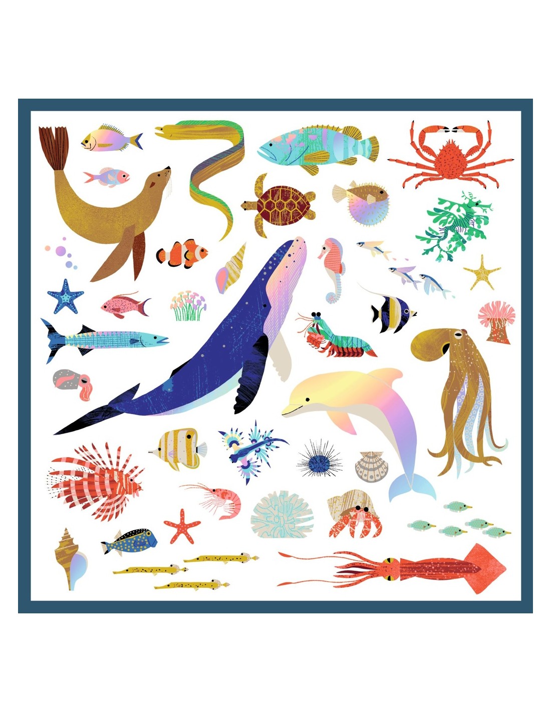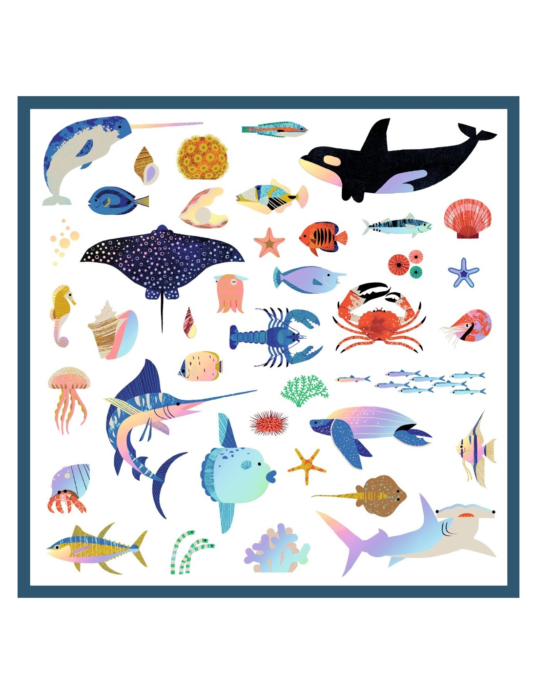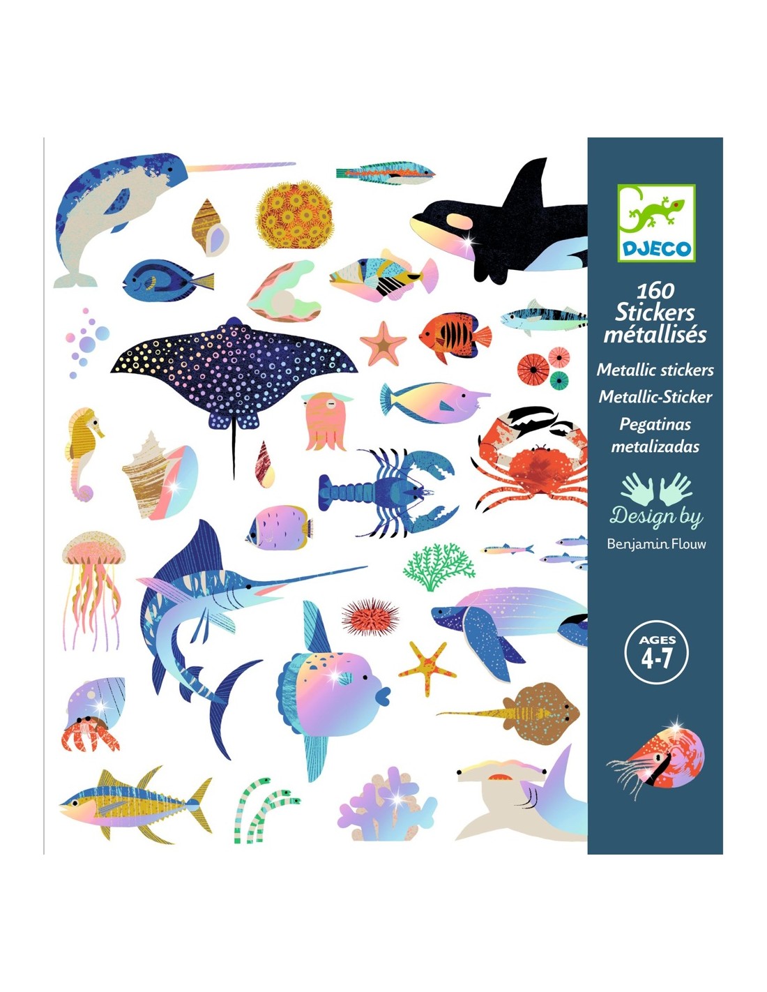 Endinsa't a les profunditats de l'oceà amb els Stickers Metal·litzats Oceà de la renomeada marca Djeco. Aquest captivador set de 160 adhesius metal·litzats submergirà els nens en un món submarí ple de fascinants criatures marines, proporcionant una experiència de joc única i plena de color.